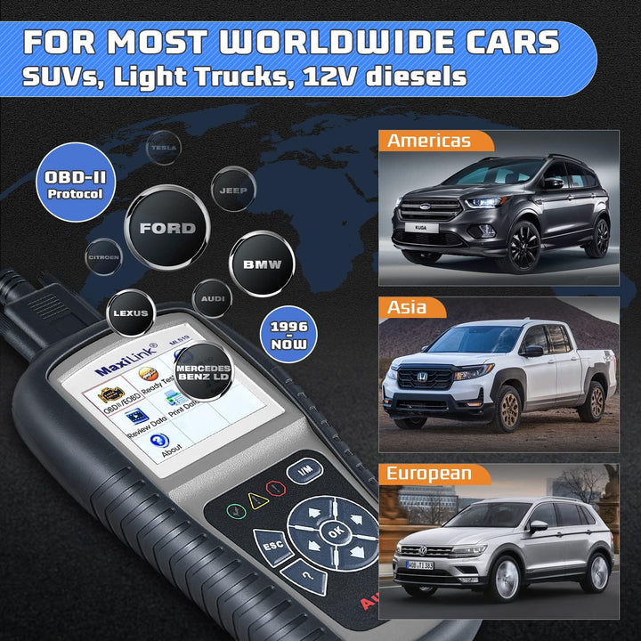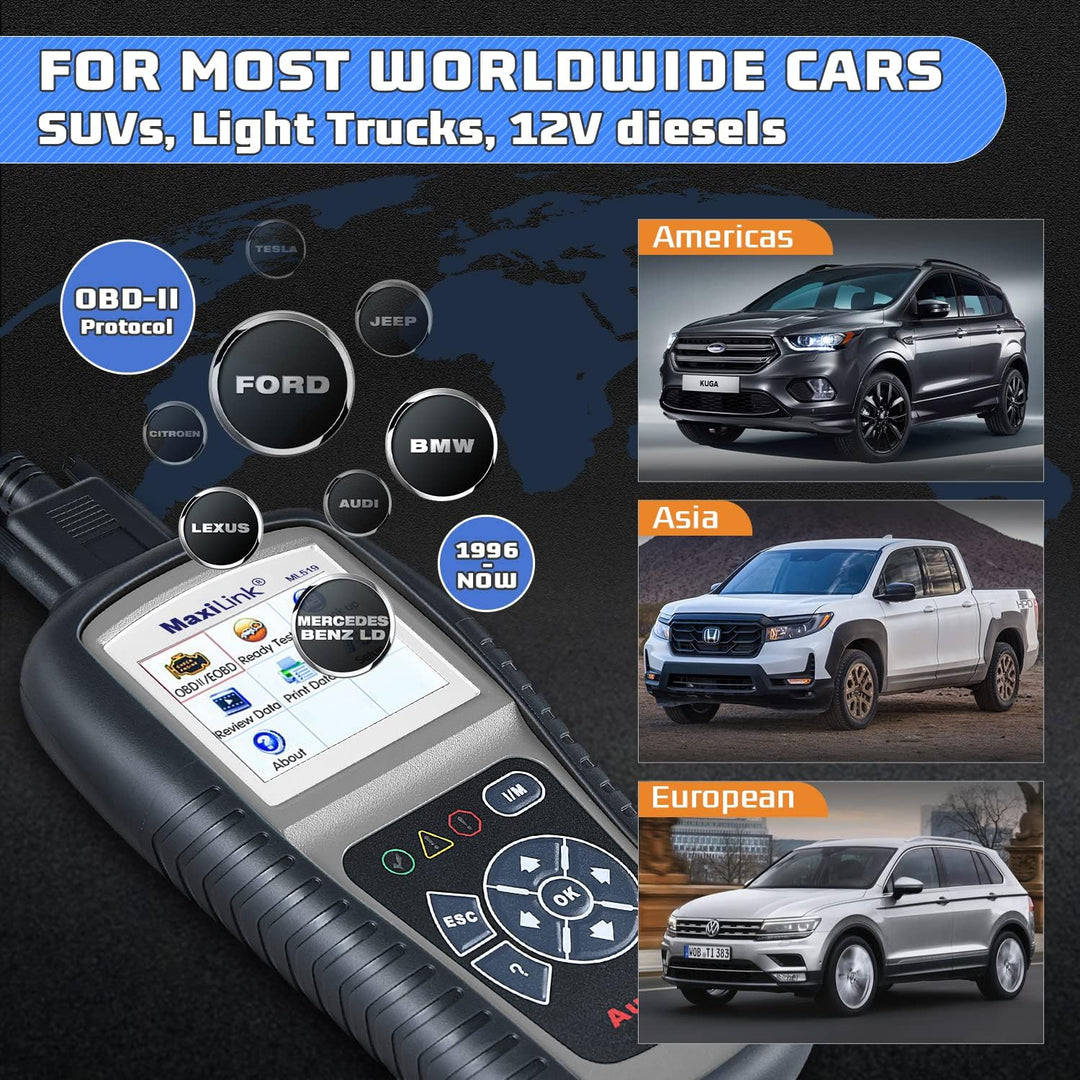 - ★【Fahrzeugabdeckung】:Der MaxiLink ML519 OBDII/EOBD Scanner ist speziell für die Verwendung mit allen OBD II kompatiblen Fahrzeugen konzipiert. Er ist mit Americian, asiatischen und europäischen Fahrzeugen 1996 und neueren Fahrzeugen (OBD II & CAN) kompatibel.