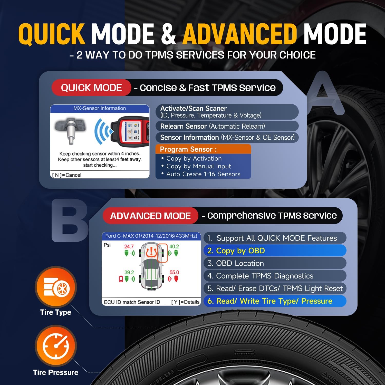 - 🥇【TPMS SCHNELLMODUS + TPMS ERWEITERTER MODUS, BENUTZERDEFINIERTE DIAGNOSE】Sie können zwischen zwei Modi wählen: TPMS-Schnellmodus und TPMS-Erweitertmodus. Der TPMS-Schnellmodus führt grundlegende TPMS-Funktionen aus, um Zeit und Energie zu