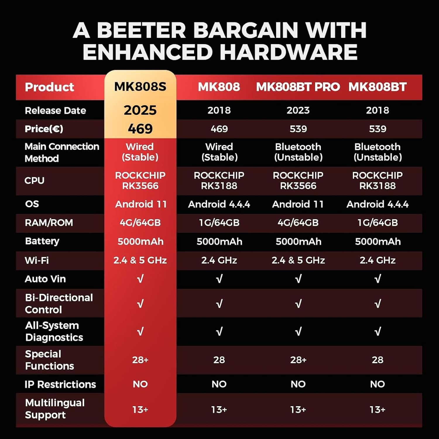 - ăschneller & AUTOVINăBasierend auf dem MK808 hat das 2023 MK808S seine Hardware aufgerĂŒstet mit: ROCKCHIP RK3566 CPU, Android 11 OS, 4G RAM, 5GHz Wi-Fi usw. um Ihnen eine schnellere Diagnose und Betrieb zu ermöglichen . Im Gegensatz zum MX808 hat