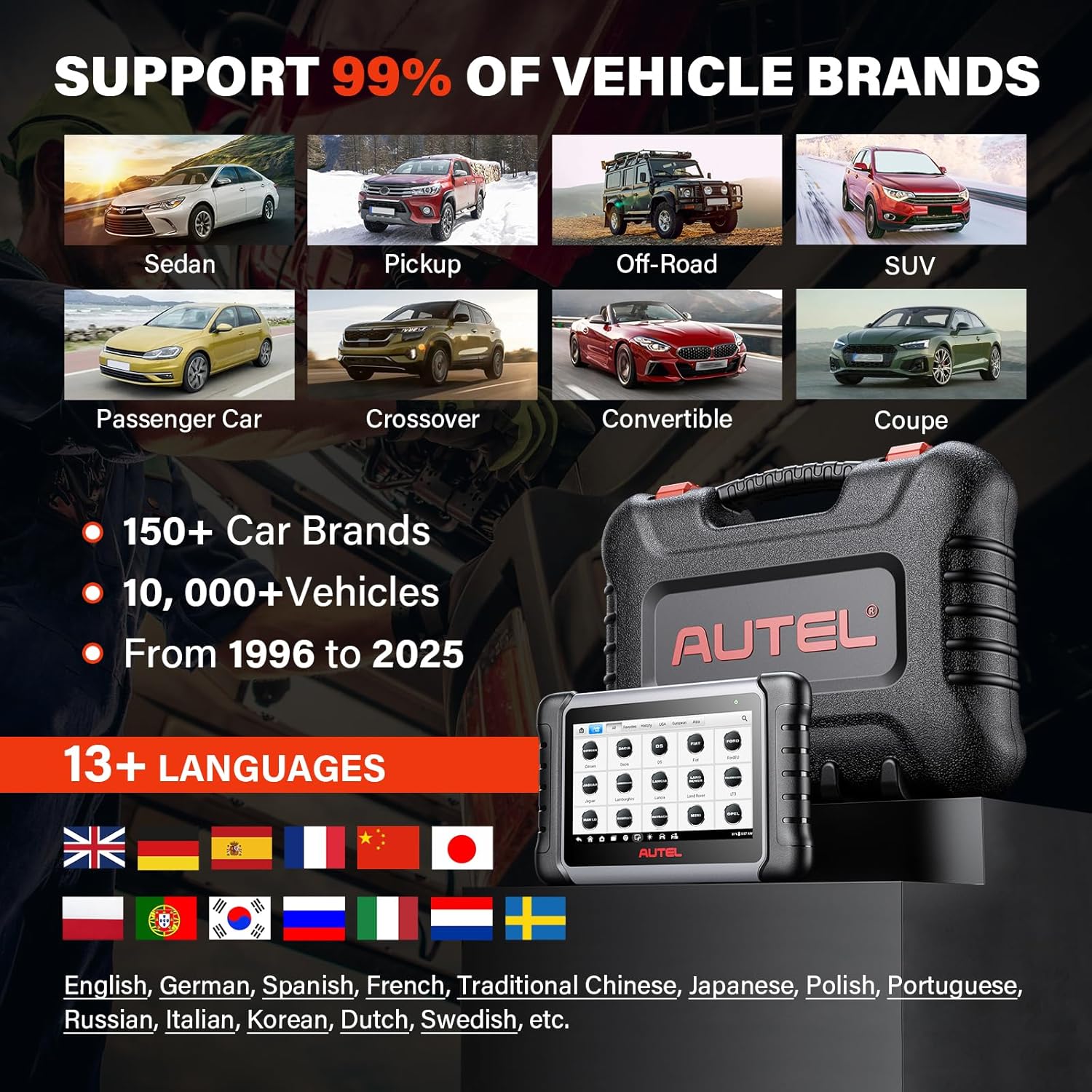 - ăALLE VERFĂGBAREN MODULE DIAGNOSEă Genau wie die Snap-on-Codeleser und MK808BT PRO funktioniert MK808S mit Reset gut bei ĂŒber 150 Automarken und -modellen weltweit (1996 und neuer), um Codes zu lesen/zu löschen und ECU-Informationen zu lesen .,