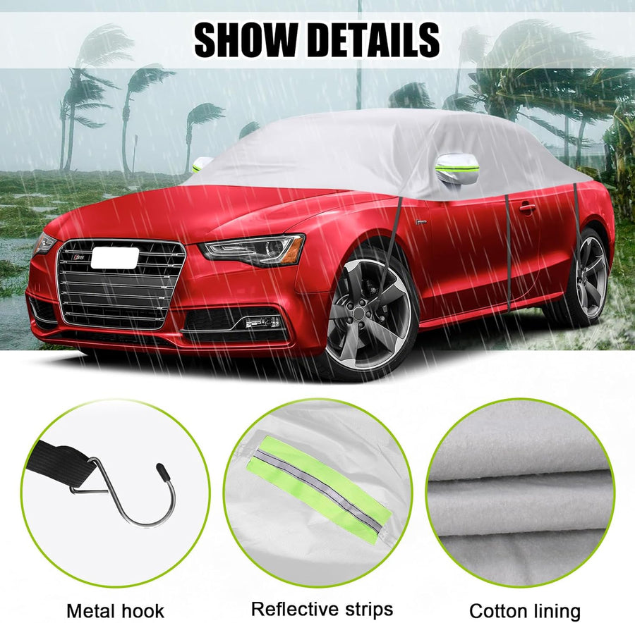 - Einfache Montage: Die Autoabdeckung verfügt über 8 elastische Bänder (drei auf jeder Seite, zwei am Kofferraum) und verstellbare Metallhaken, um die Karosserie fest zu befestigen. Die Rahmen auf beiden Seiten sind mit Ohrenschützern ausgestattet, um