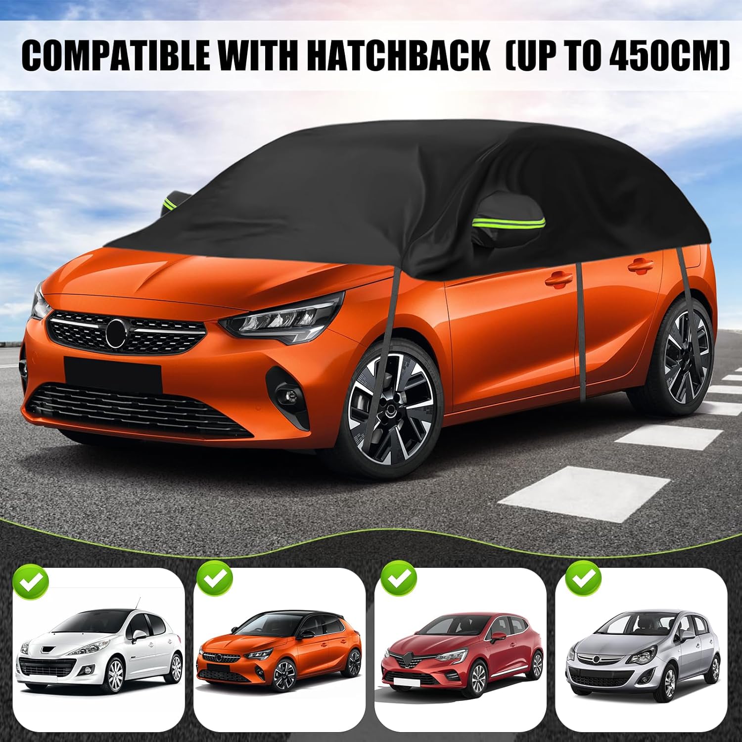 - Kompatibel mit: Universelle Halbe Autoabdeckung für Fliessheck (338 x 150 x 49 cm), Ersatz für Opel Corsa D, Ersatz für VW Golf, Ersatz für Renault Clio, Ersatz für Peugeot 207 208, Ersatz für Dacia Sandero. Bitte überprüfen Sie vor dem Kauf, ob