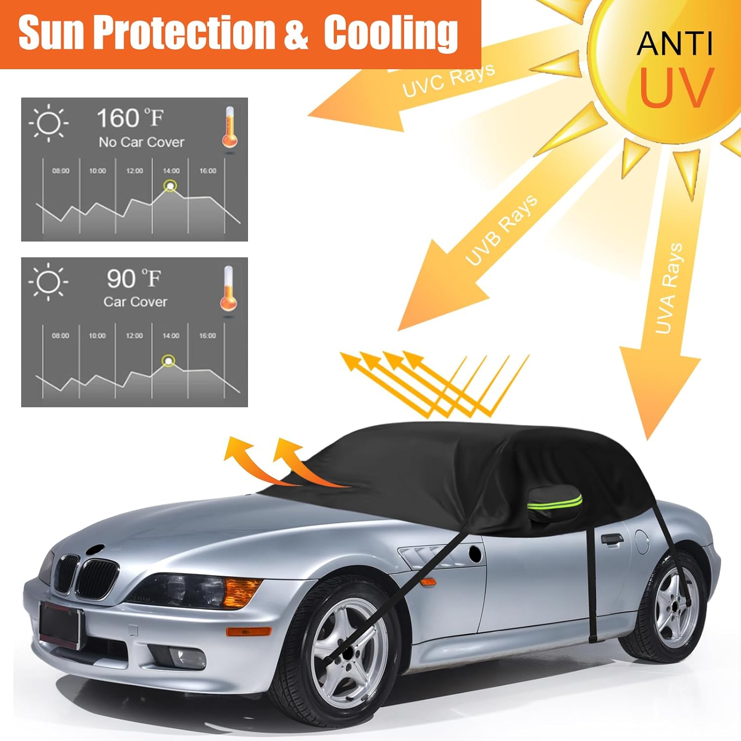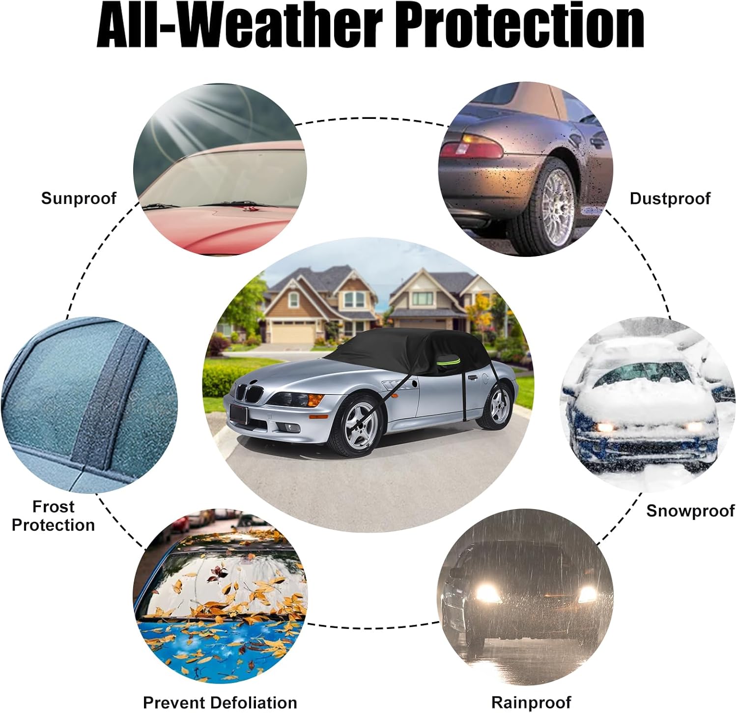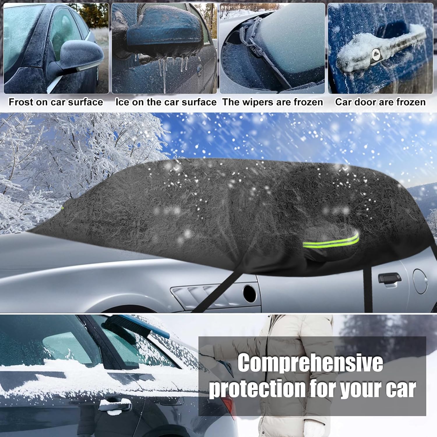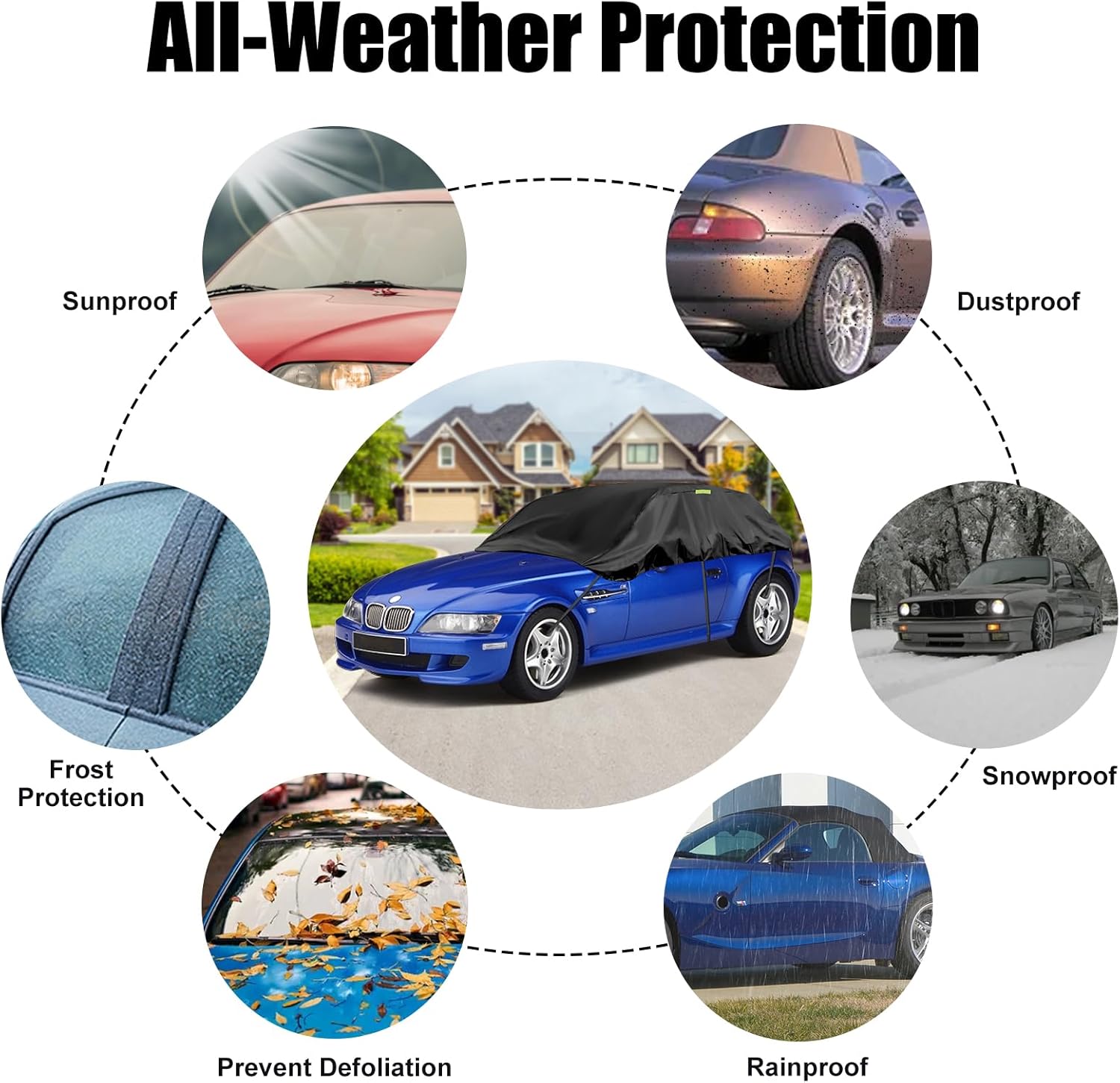 - Rundumschutz: Deckt Windschutzscheibe, Seiten-/Heckscheiben, Rückspiegel ab und schützt Ihr Auto vor Schnee, Frost, Vogelkot, UV-Strahlen, Regen, Staub usw. Ob heisser Sommer, rote Blätter im Herbst oder starker Schneefall im Winter, die