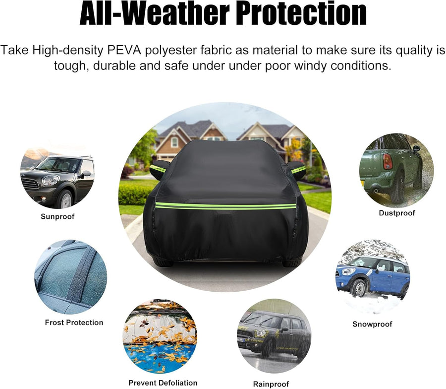 - Einfach zu installieren: Die elastischen Kanten der Autoabdeckung passen perfekt zu Ihrem Auto, und der untere Riemen und die Windschutzscheibe verfügen über eine doppelte Fixierung, um Ihr Auto auch an windigen Tagen an Ort und Stelle zu halten. Die