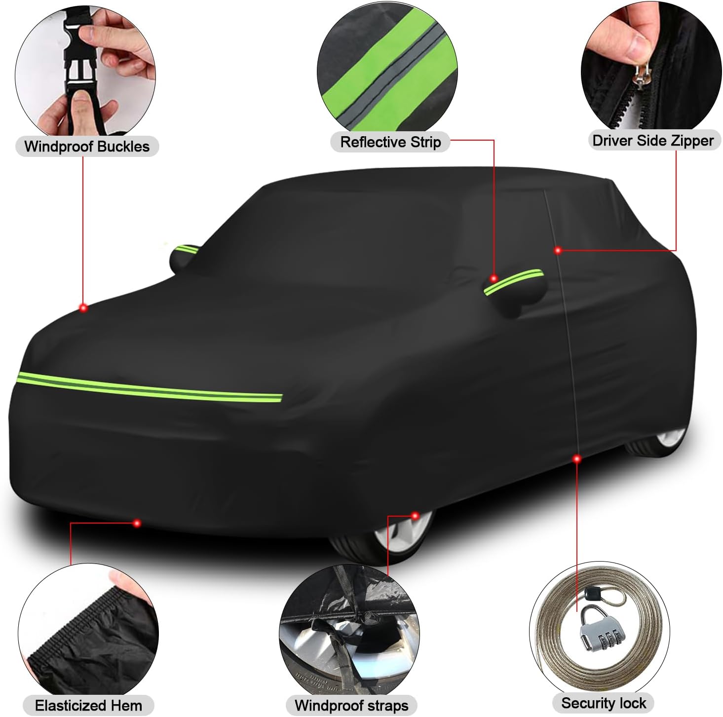 - Einfach zu installieren: Die elastischen Kanten der Autoabdeckung passen perfekt zu Ihrem Auto, und der untere Riemen und die Windschutzscheibe verfügen über eine doppelte Fixierung, um Ihr Auto auch an windigen Tagen an Ort und Stelle zu halten. Die