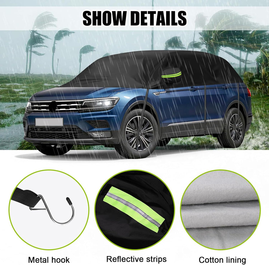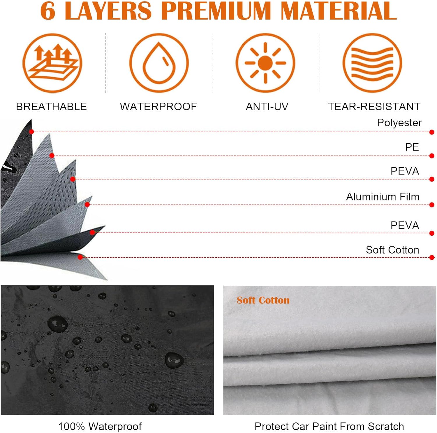- Einfache Montage: Die Autoabdeckung verfügt über 8 elastische Bänder (drei auf jeder Seite, zwei am Kofferraum) und verstellbare Metallhaken, um die Karosserie fest zu befestigen. Die Rahmen auf beiden Seiten sind mit Ohrenschützern ausgestattet, um