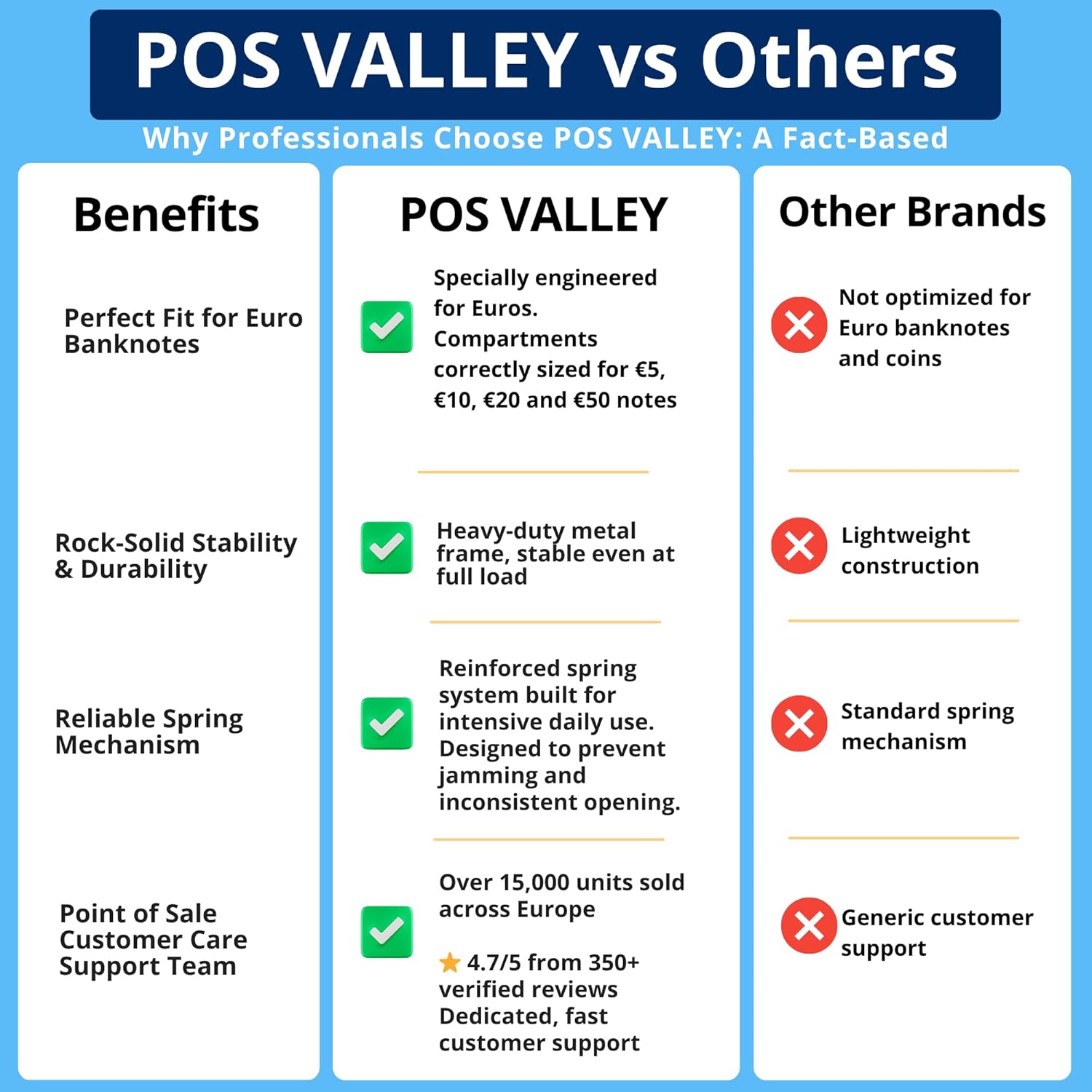 - Vertrauen von tausenden: POS VALLEY bietet zuverlässige, intelligente und langlebige Lösungen für die Geldverwaltung, die von Unternehmen weltweit geschätzt werden. Unsere Produkte werden mit grosser Sorgfalt und nach höchsten Qualitätsstandards
