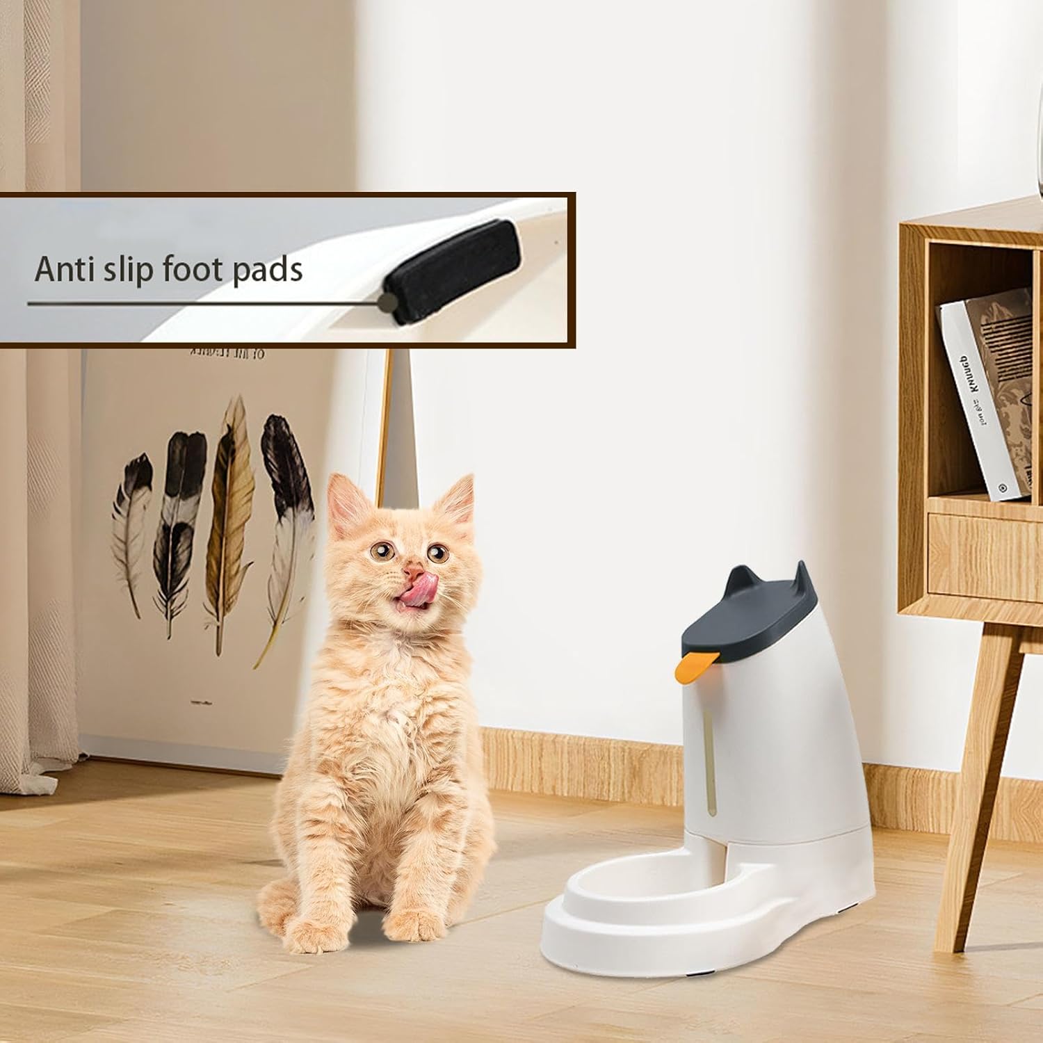 - Anti-Rutsch-Design: Das Anti-Rutsch-Pad-Design der Basis unseres automatischen Katzenfutterautomaten sorgt dafür, dass der Spender an Ort und Stelle bleibt und nicht umkippt, sodass die Mahlzeit Ihres Haustieres sicher und sicher bleibt.