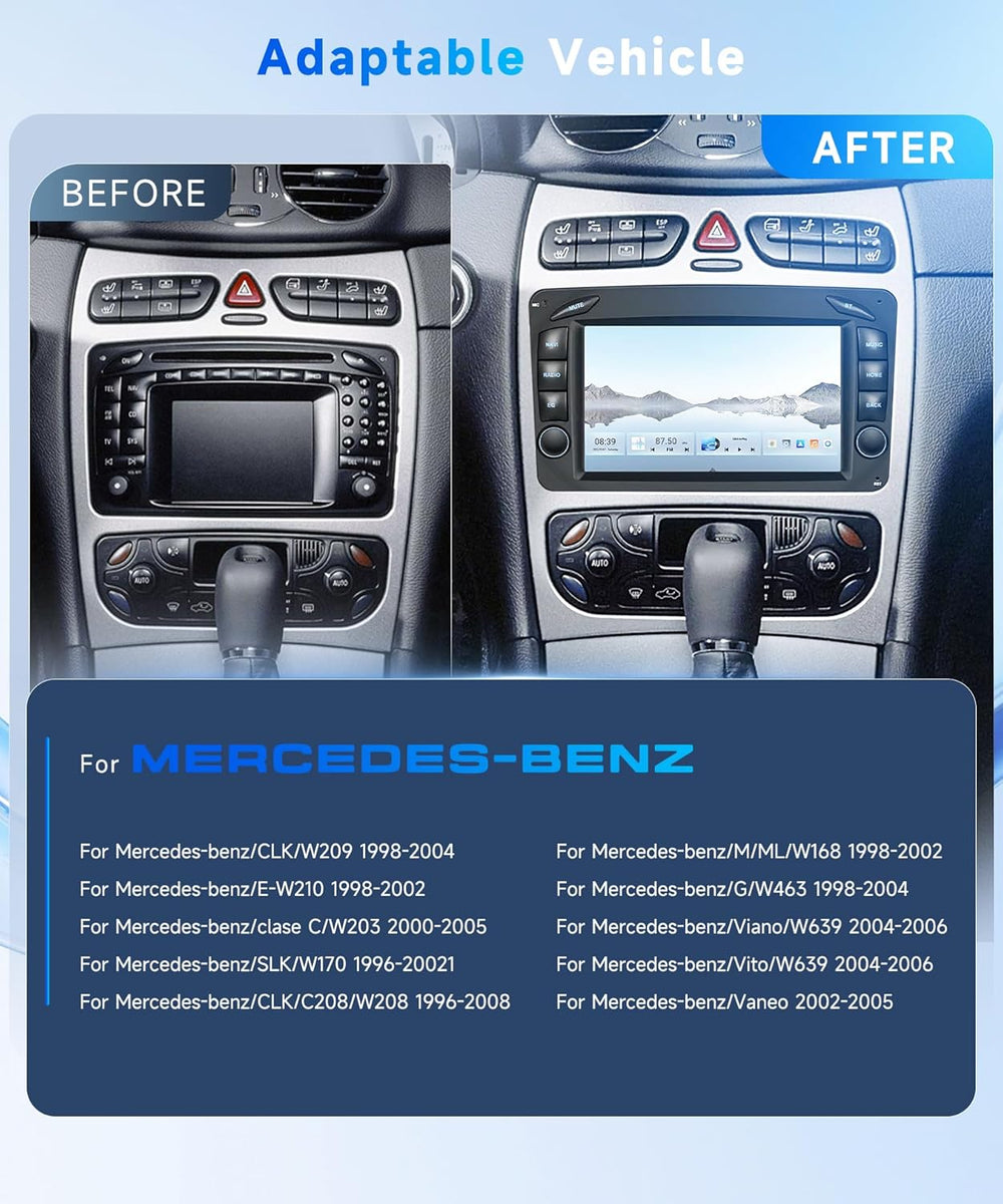 - Android 15 Autoradio mit Eingebautem Qual-comm Chip: Dieses Android Autoradio passt für Mercedes Benz C CLK G Classe W203 W209 W463 Viano Vito W639. Es mit Android 15 Betriebssystem, 8 Core CPU, 4G RAM + 64G ROM für mehrere APP Installation. Sein