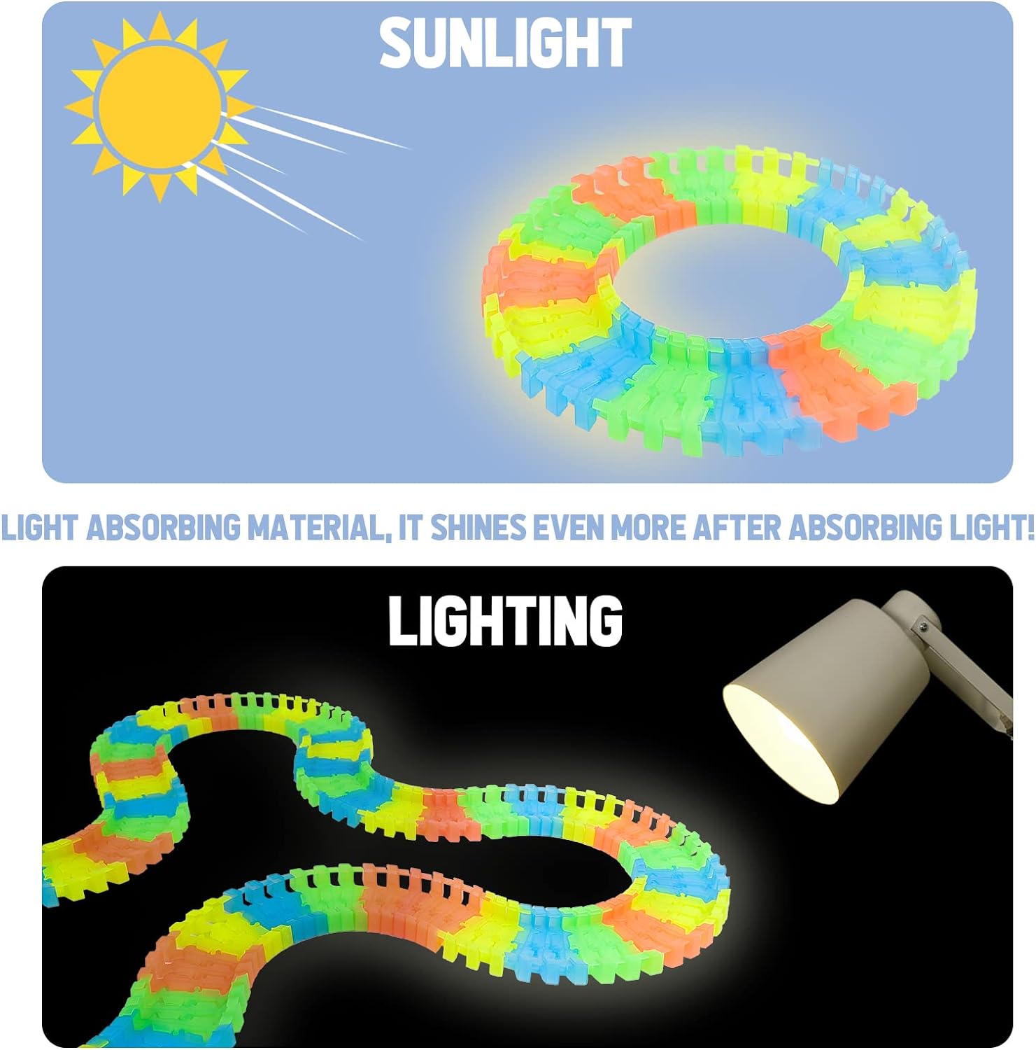 - 【Auto Spielzeug & Autorennbahn Glow in the Dark】In der dunklen Umgebung wird das glow cars spielzeug das auf den fantastischen leuchtend rennbahn fährt, das Kind sicherlich in Erstaunen versetzen. auch im Dunkeln, viadukte anbringen und mit den 2 mitgelieferten LED auto spielzeug Rennen fahren . 240 Stück autorennbahn spielzeug set in mehrere Strecken unterteilt werden, mehrere Kinder können gemeinsam am Spiel teilnehmen. Spielzeugauto Grösse: ca. 9 * 5 * 5,5 cm (benötigt 2AA, nicht enthalten)