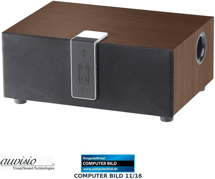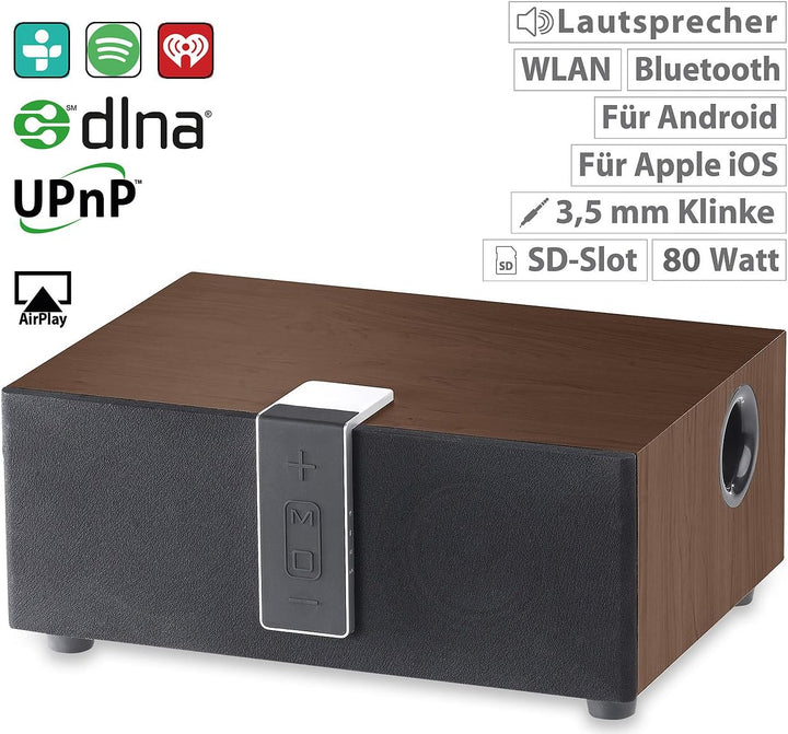 auvisio HiFi-Lautsprecher: WLAN-Multiroom-Lautsprecher mit Subwoofer, BT, Airplay, 80 W, walnuss (Br