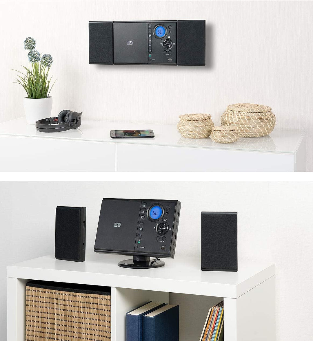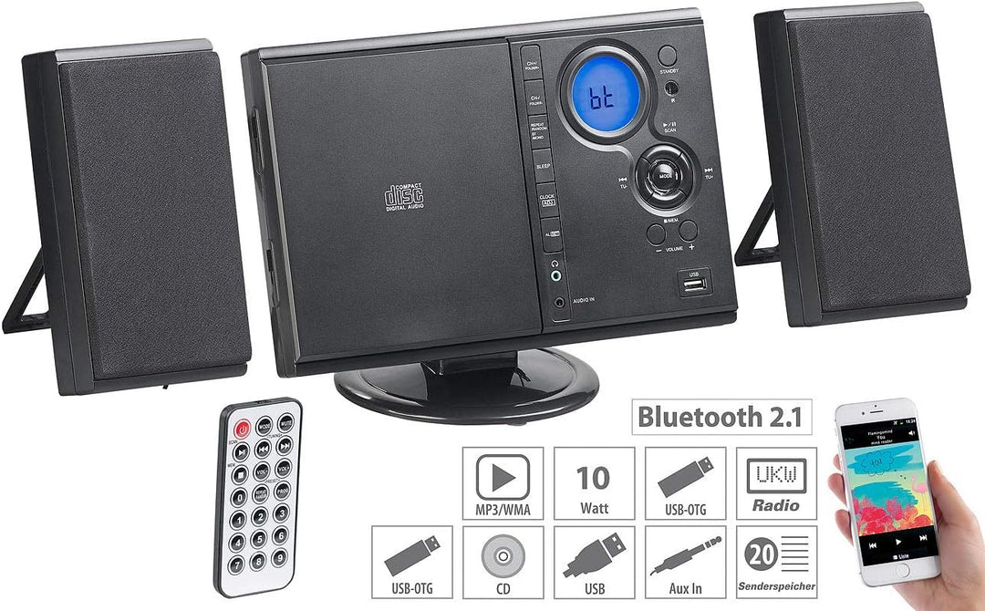 - Spielt Audio-, MP3- und WMA-CDs • MP3- und WMA-Wiedergabe auch von USB-Stick • Kabellose Musikwiedergabe von Smartphone & Co. • 20 Sender-Speicher für Ihre Lieblings-Radiosender • Elegantes vertikales Design • Zum Aufstellen oder für
