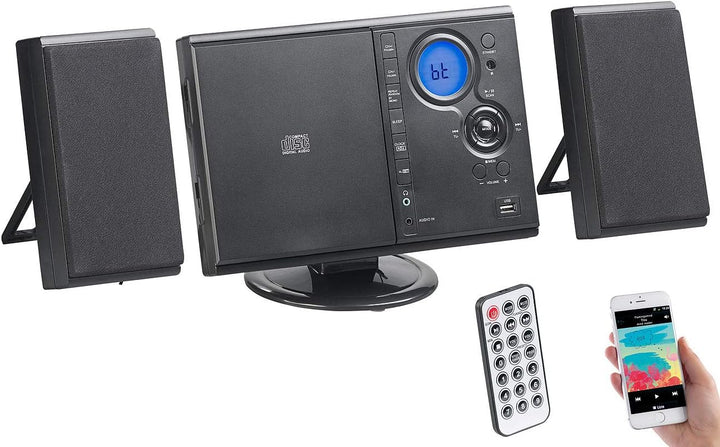 - Stereo-Kompaktanlage für Musik per Bluetooth, CD, USB und Radio • MP3- und WMA-Wiedergabe auch von USB-Stick bis 32 GB (bitte dazu bestellen) • Kopfhörer-Anschluss (3,5-mm-Klinke) • Einfache Bedienung per Tasten auf der Oberseite oder per
