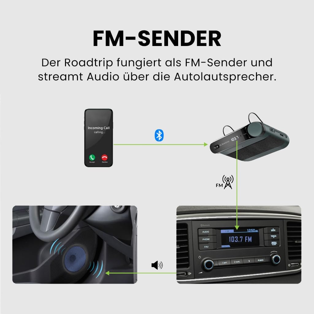 - [2-in-1-Auto-Freisprecheinrichtung & FM-Transmitter] Der Roadtrip fungiert als Bluetooth-Freisprecheinrichtung für das Auto zum Annehmen von Anrufen mit Ihrem Smartphone mit der Fähigkeit von Siri oder Google Assistant, Anrufe zu tätigen, Texte zu