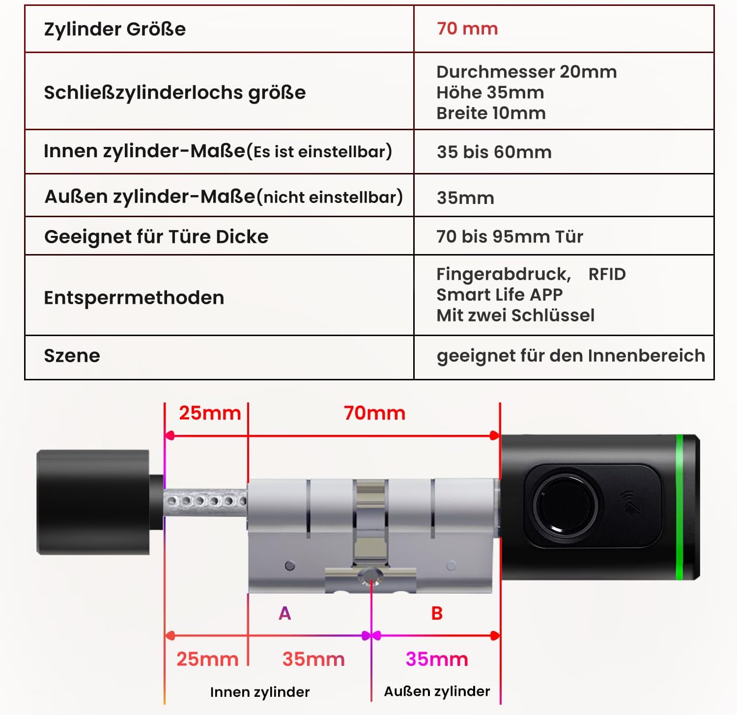 - 【Elektronischer Türschliesszylinder Länge】: Innenmasse 35mm – 60mm, Es ist einstellbar. Aussenmasse 35mm, nicht einstellbar. Geeignet für Türen mit einer Dicke zwischen 70 und 95mm. Der Durchmesser des Schliesszylinderlochs ist 20mm, die Höhe