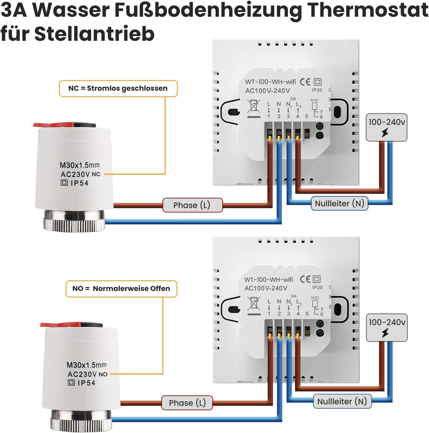 - 【WiFi Wasser Fussbodenheizung Thermostat】➤AVATTO Smart WiFi Programmierbare Wasser-Fussbodenheizung Thermostate werden zur Regelung der Raumtemperatur, zur Steuerung von NC- oder NO-Stellantrieben in der Warmwasserbereitung verwendet.