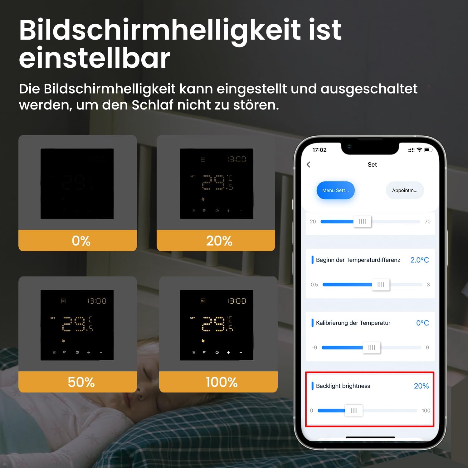 - Temperaturkalibrierung➤Wenn zwischen der tatsächlichen Temperatur und der auf dem smart Thermostat angezeigten Temperatur ein Unterschied besteht, können Sie diese mithilfe der Kalibrierungsfunktion anpassen. Bildschirmhelligkeit➤Die