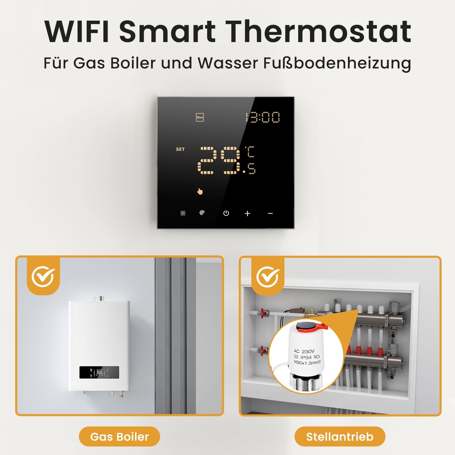 - Smart WiFi Wasser Fussbodenheizung Thermostat➤Wird zur Steuerung des Öffnens und Schliessens des am Wasserabscheider installierten Stellantrieb verwendet. DieserThermostat unterstützt nur elektrische Stellantriebe mit einer Spannung von 110 bis 240