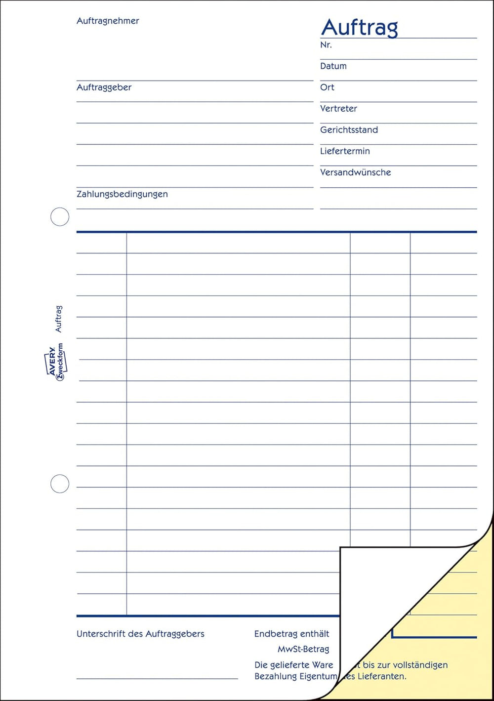 - Selbstdurchschreibendes Auftragsbuch mit jeweils einem gelben Durchschlag - 1. und 2. Blatt bedruckt, mit Unterschriftenfeld für den Auftraggeber
