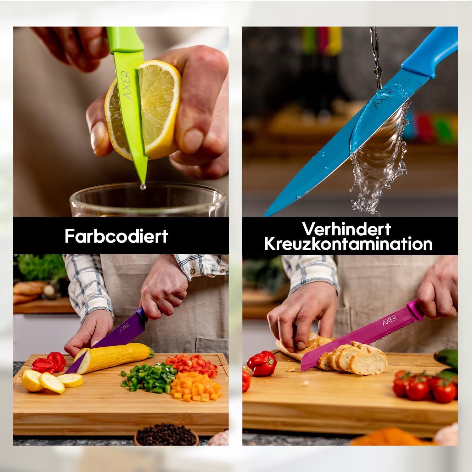 - 🔪 FARBCODIERUNG - Die Küchenmesser verfügen über mehrfarbige Beschichtungen, die einen besseren Schutz vor Rost bieten und das Risiko einer Kreuzkontamination verringern