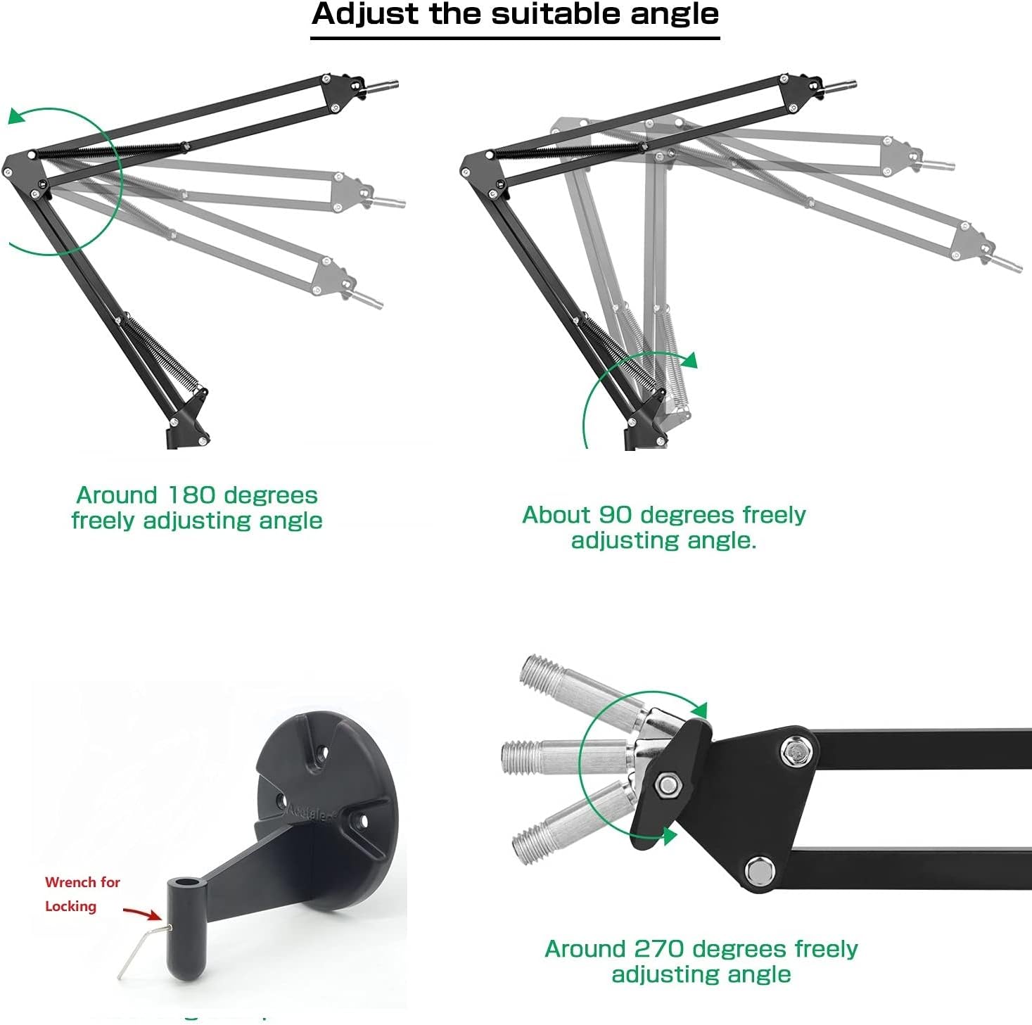 • Webcam-Wandhalterung: Höhe kann verstellt werden, max. 83 cm durch Verriegelungs-/Entriegelungsknopf mit Schraubenschlüssel; kommt mit 1/4‘’-20-Gewinde. Hergestellt aus dickerer und besserer Aluminiumlegierung