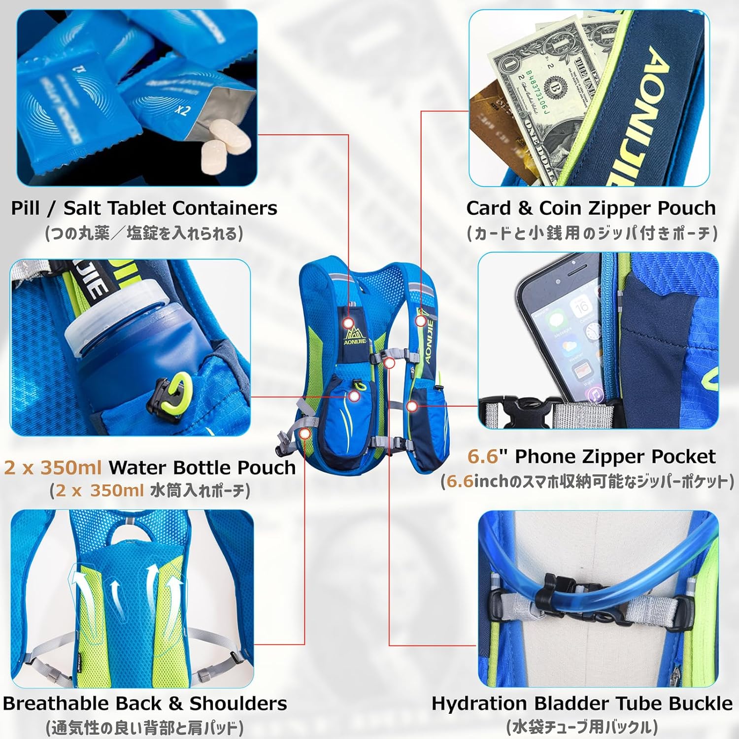 - 🌊 LEICHT UND ATMUNGSAKTIV: Der Azarxis 5.5L ist ein leichter Rucksack, der dir auf deinen Lauf- und Radtouren insgesamt 5.5L Stauraum bietet. 2 Brusttaschen für 250 ml Flasche + ein grosser hinterer Stauraum für 2L Trinkblase. Ausgestattet ist der