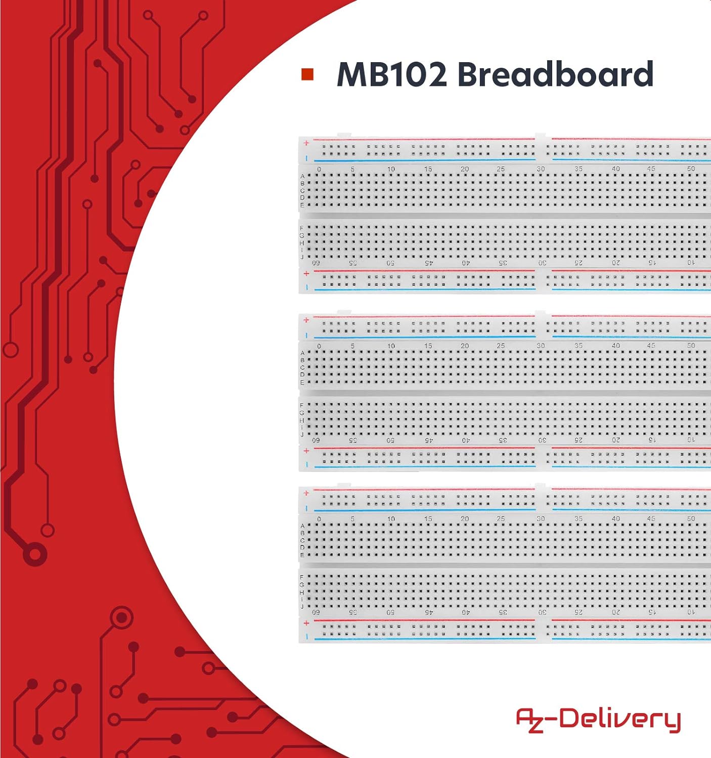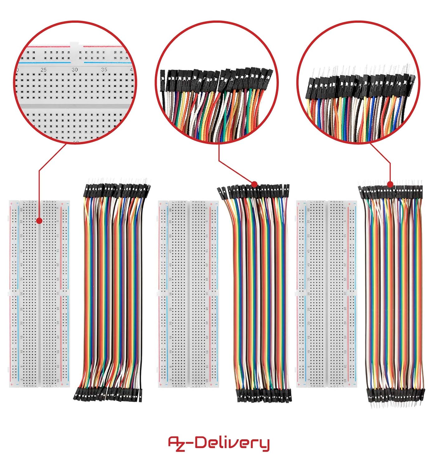- ✅ Sichern Sie sich jetzt fünf AZDelivery Breadboard Kit - 3x Jumper Wire m2m/f2m/f2f + 3er Set MB102 Breadbord zum Vorteilspreis mit Mengenrabatt!