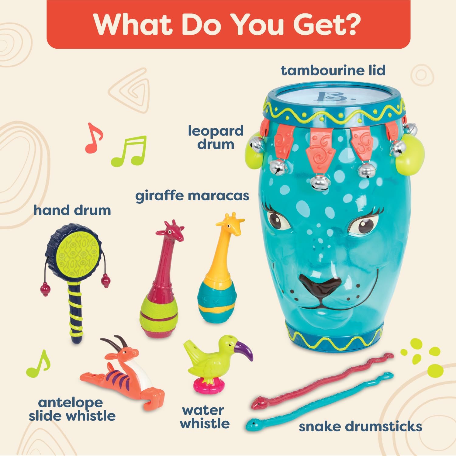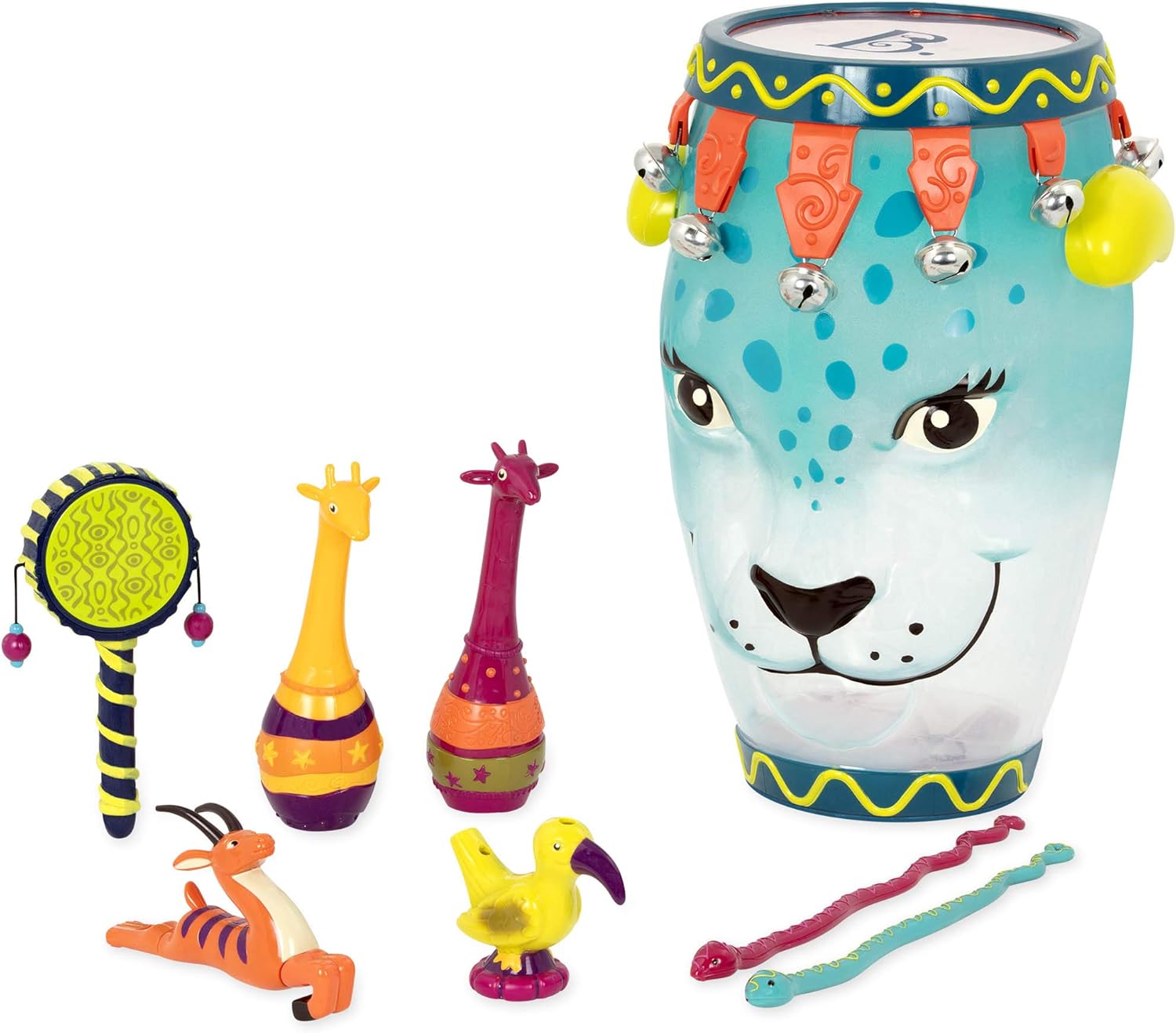 • Dieses Set enthält ein Leoparden Bongo, einen abnehmbaren Tamburin Deckel, Schlangen Trommelstöcke, Giraffen Maracas, eine Antilopen Pfeife, eine Hornvogel Pfeife und eine Hand-Trommel