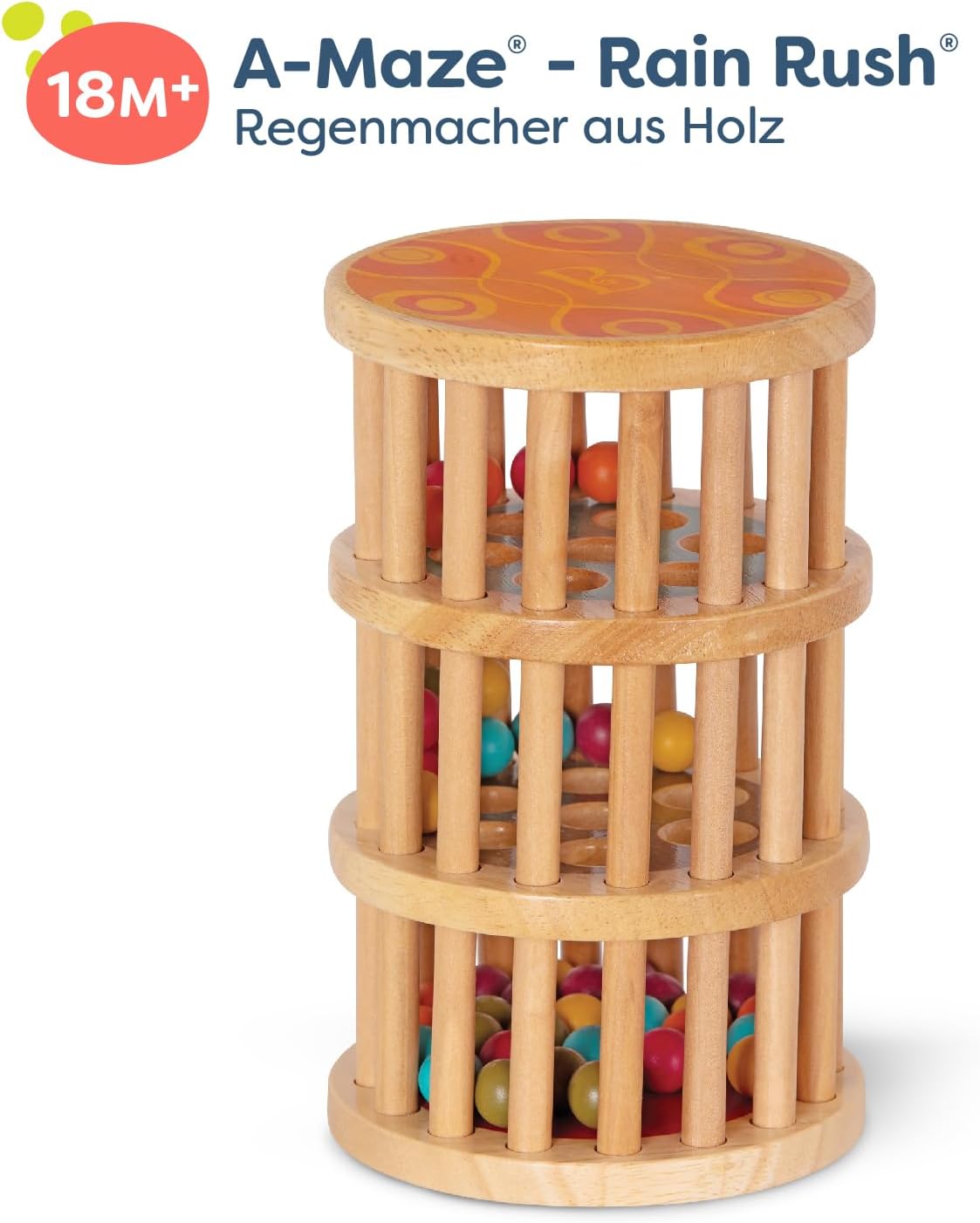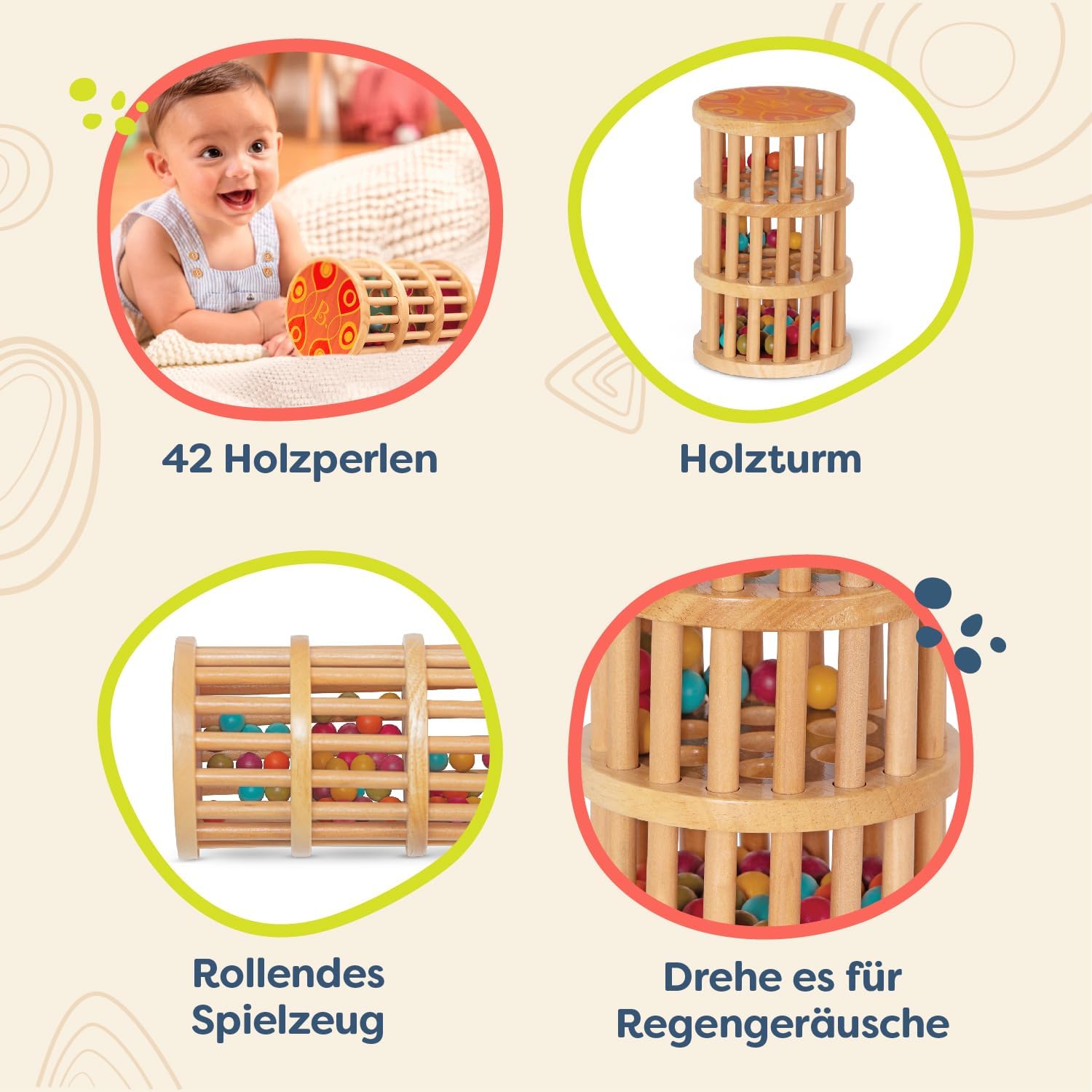 - Ein klassisches Holzspielzeug! 42 bunte Holzperlen, die Regengeräusche erzeugen, wenn sie durch das Spielzeug fallen. Drehe das Spielzeug, um die Perlen sanft herunterkullern zu hören, oder rollen es den Flur hinunter, um hinterher zu krabbeln
