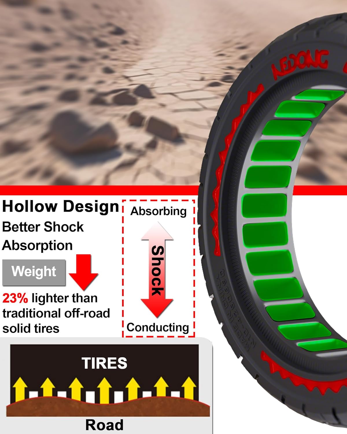• Schockabsorbierung: Die präzisionsgefertigte 50/75-6.1 Wabenstruktur absorbiert Pannen, indem sie Stösse über mehr als 120 sechseckige Zellen verteilt, während das schlauchlose Design den Reifen ohne Luft fest an der Nabe hält
