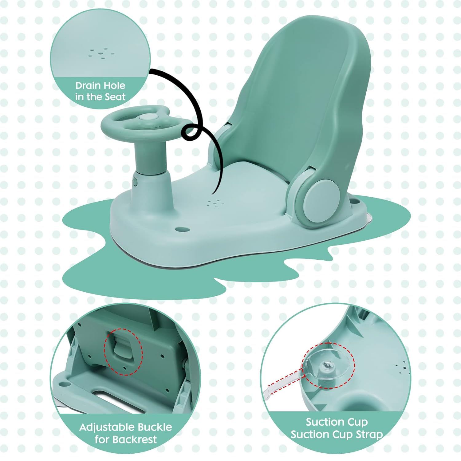 - 【Starke Saugnäpfe & Lenkradgriff】Der rutschfeste Babysitz verfügt über vier rutschfeste Saugnäpfe, um das Baby zu fixieren und ein Umkippen zu verhindern. Das hervorstehende Design an der Seite des Saugnapfes erleichtert das Abheben des