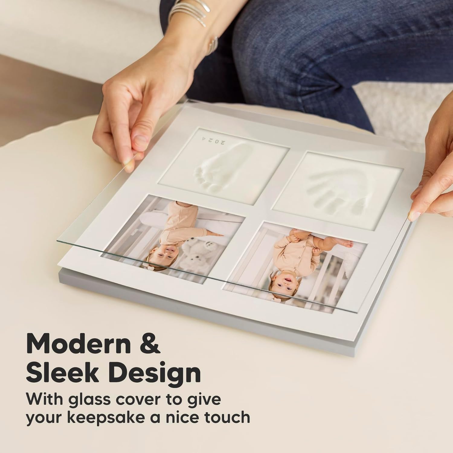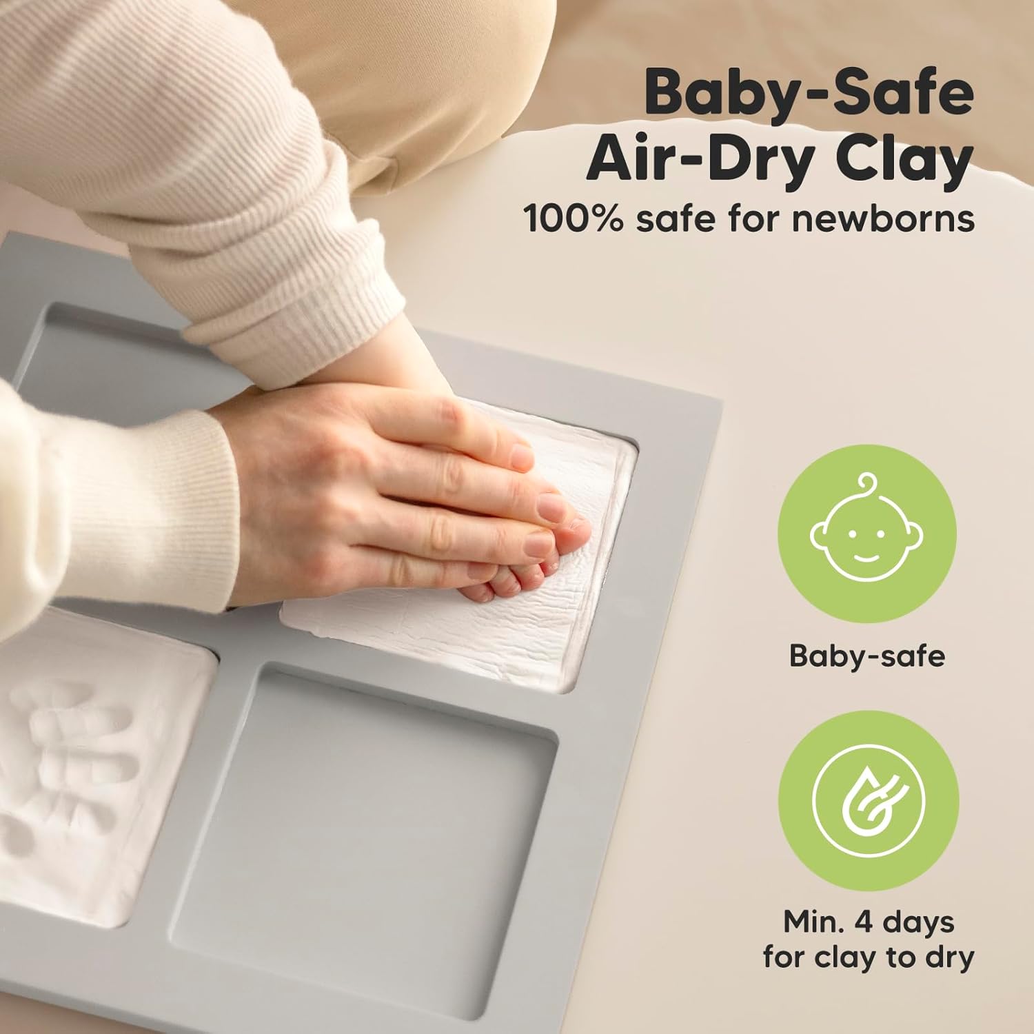 - Ever Baby Handabdruck und Fussabdruck Set - Das All-in-1 Abdruckset Baby beinhaltet alles, was Sie brauchen. Ein hochwertiger Holzrahmen (29cm x 29cm), eine kristallklare Glasabdeckung, 4 Ausschnitte, 2x babysicherer lufttrocknender Ton, Alphabetstempel