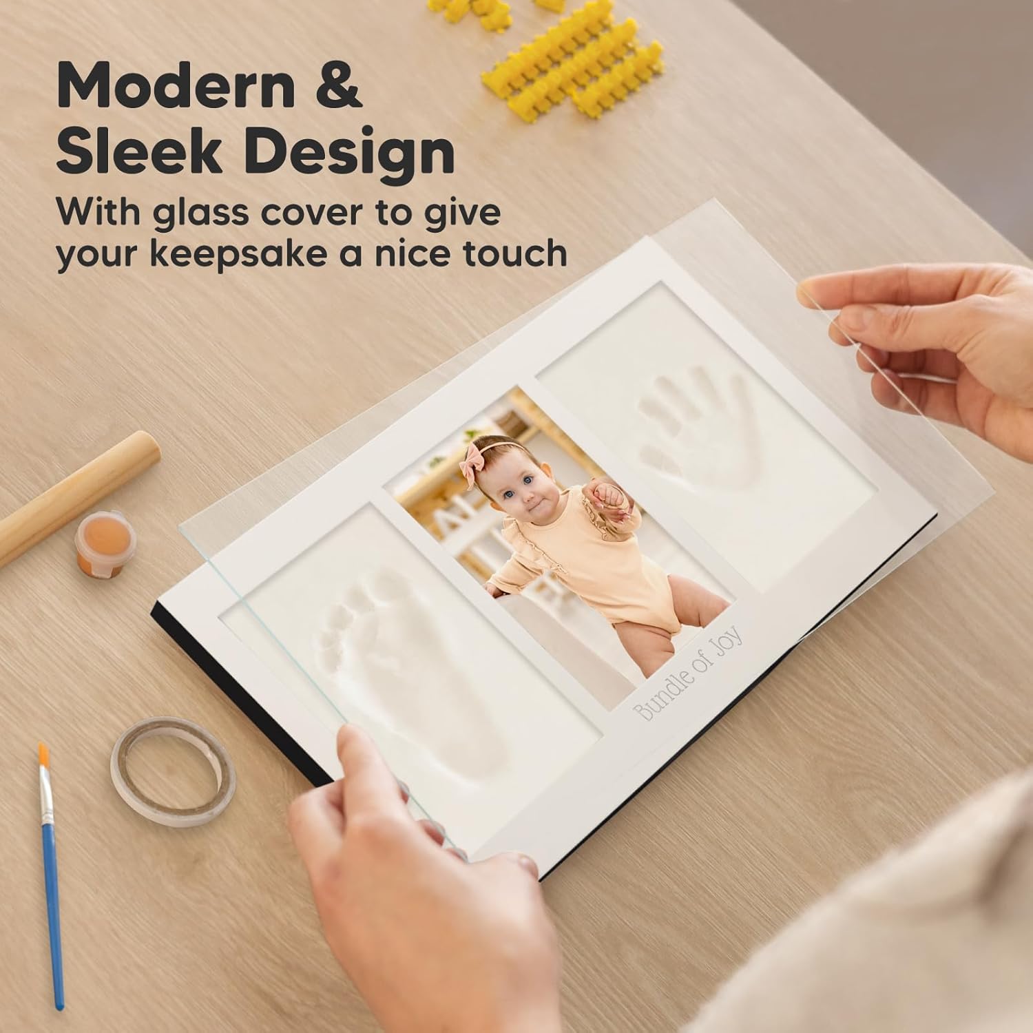 • Personalisieren Sie Ihren Fotorahmen – Unser Handabdruck und Fussabdruck Baby Set wird mit Goldfarbe, Pinsel und Namens-/Datumsdruck-Set als Bonus geliefert. Sie können es so gestalten, wie Sie möchten, und aus den Rahmen in 4 Farben auswählen, die