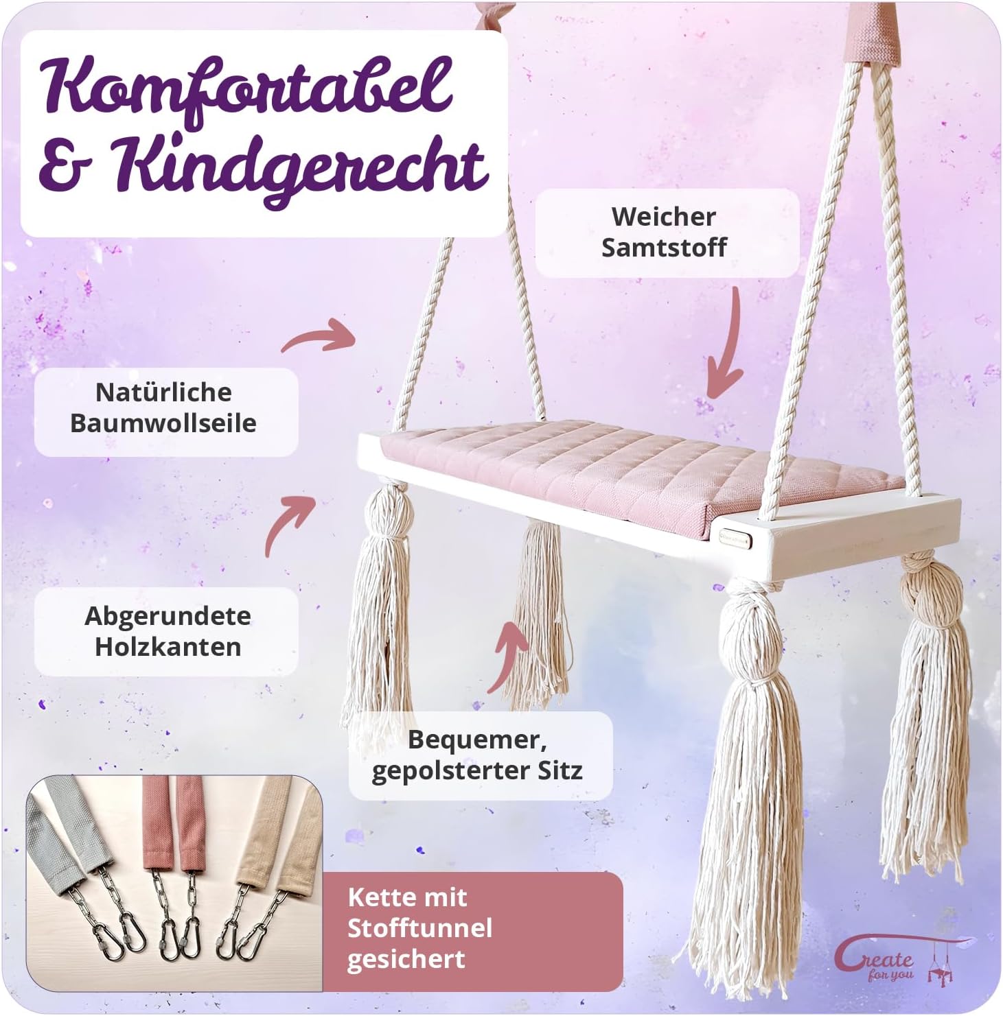 - Schaukel Kinderzimmer: Unsere Schaukel ist aus weichem, gestepptem Samtstoff gefertigt, der nicht nur für Komfort, sondern auch für Haltbarkeit sorgt. Die dekorativen langen Stofftunnel verleihen der Schaukel einen besonderen Charme, während die