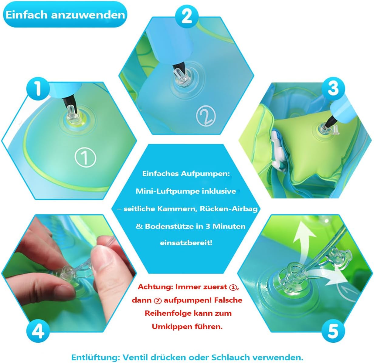 • 👍✅【Sicherheitsschutz】 Zweischichtige Luftkammer, erhöhte Front, verbreiterte Seiten, Schultergurt, BauchstĂŒtze, Schrittgurt, hĂ€lt das Kind an Ort und Stelle, um ein Umkippen oder Herausrutschen zu verhindern. Sicherheit steht immer an erster