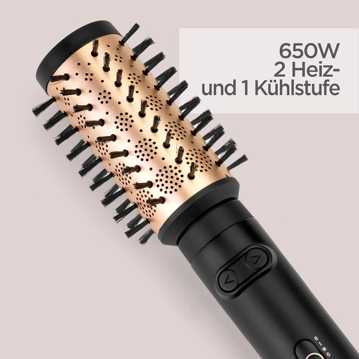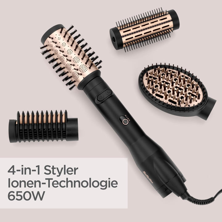 - 4-in-1 Funktion: 50mm rotierender Bürstenaufsatz für Volumen, 38mm fixierter Bürstenaufsatz zum Formen, Glättbürste zum Glätten, Paddle-Brush zum Kämmen