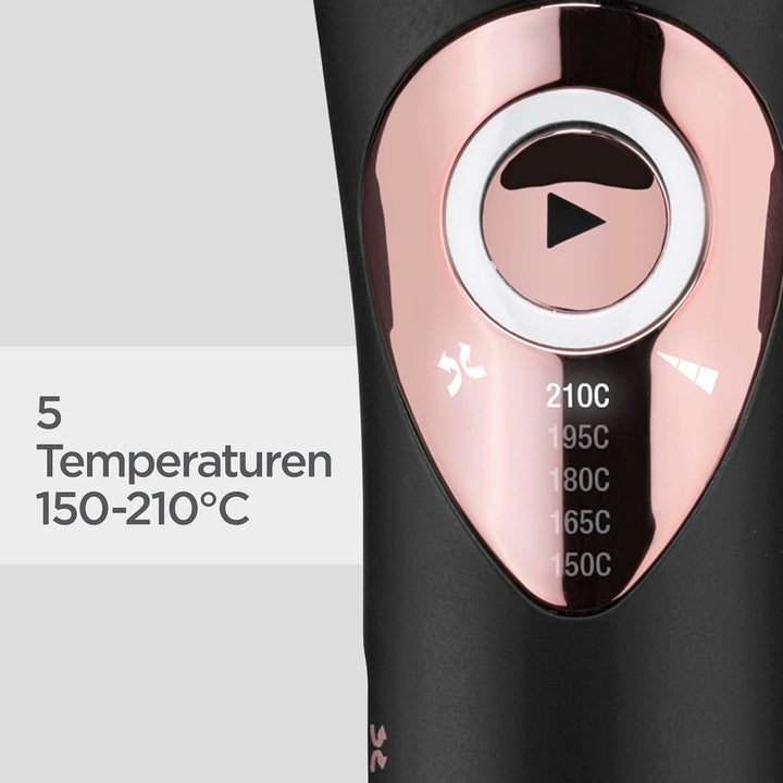 - 5 Heizstufen von 150°C bis 210°C für alle Haartypen. 3 Zeitstufen für verschiedene Lockenarten: Von definierten Locken bis hin zu sanften Wellen.
