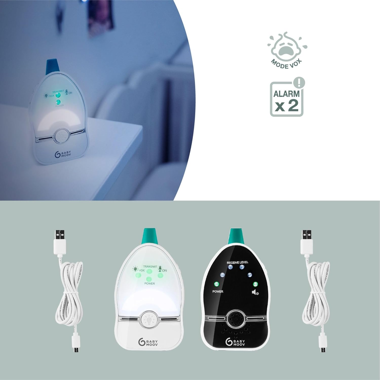 - VOX-MODUS: Ein visueller oder akustischer Alarm benachrichtigt Sie nur, wenn Ihr Baby aufwacht, weint; Diese Funktion wird auf der Babyeinheit aktiviert, wenn Sie sie verwenden möchten