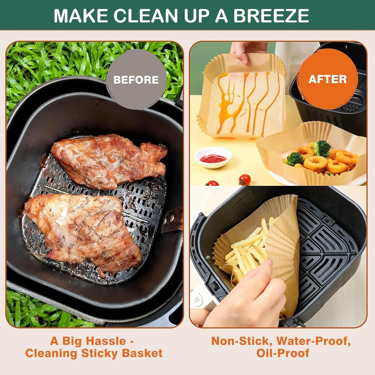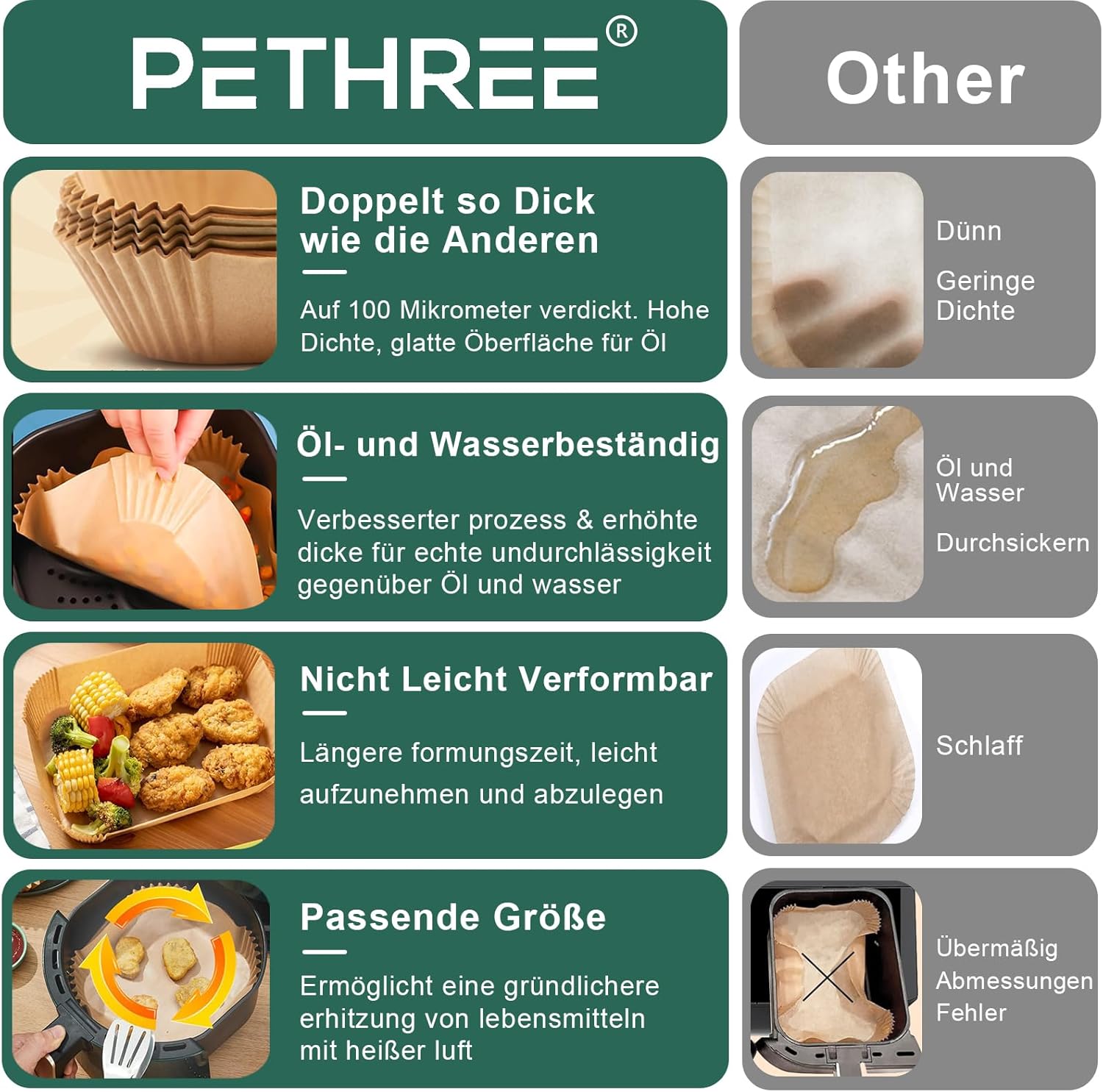 - 【Weit verbreitet】PETHREE 23-27cm quadrat heissluftfritteuse backpapier kann zum Backen, oder Aufbewahren von Lebensmitteln verwendet werden. Abmessungen der Unterseite: 23x23 cm, Abmessungen der Oberseite: 27x27 cm. Als perfektes Heissluftfritteuse