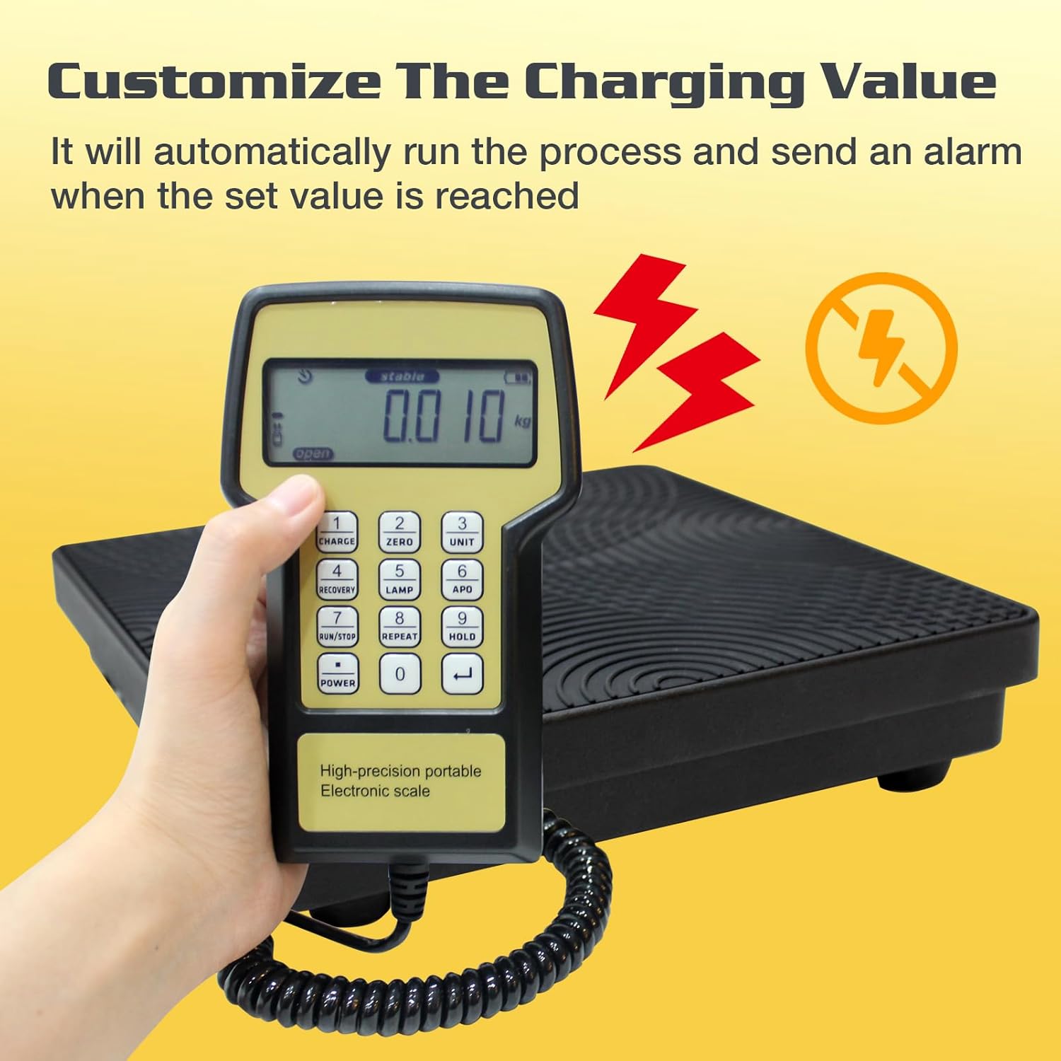 - 【Professionelle Kältemittelwaage】Die verbesserte Kältemittelwaage unterstützt die individuelle Anpassung des Kältemittelgewichts beim Befüllen oder Recyceln und ermöglicht so eine präzise Steuerung. Genauigkeit: ±0,05 % vom Messwert + 10g.