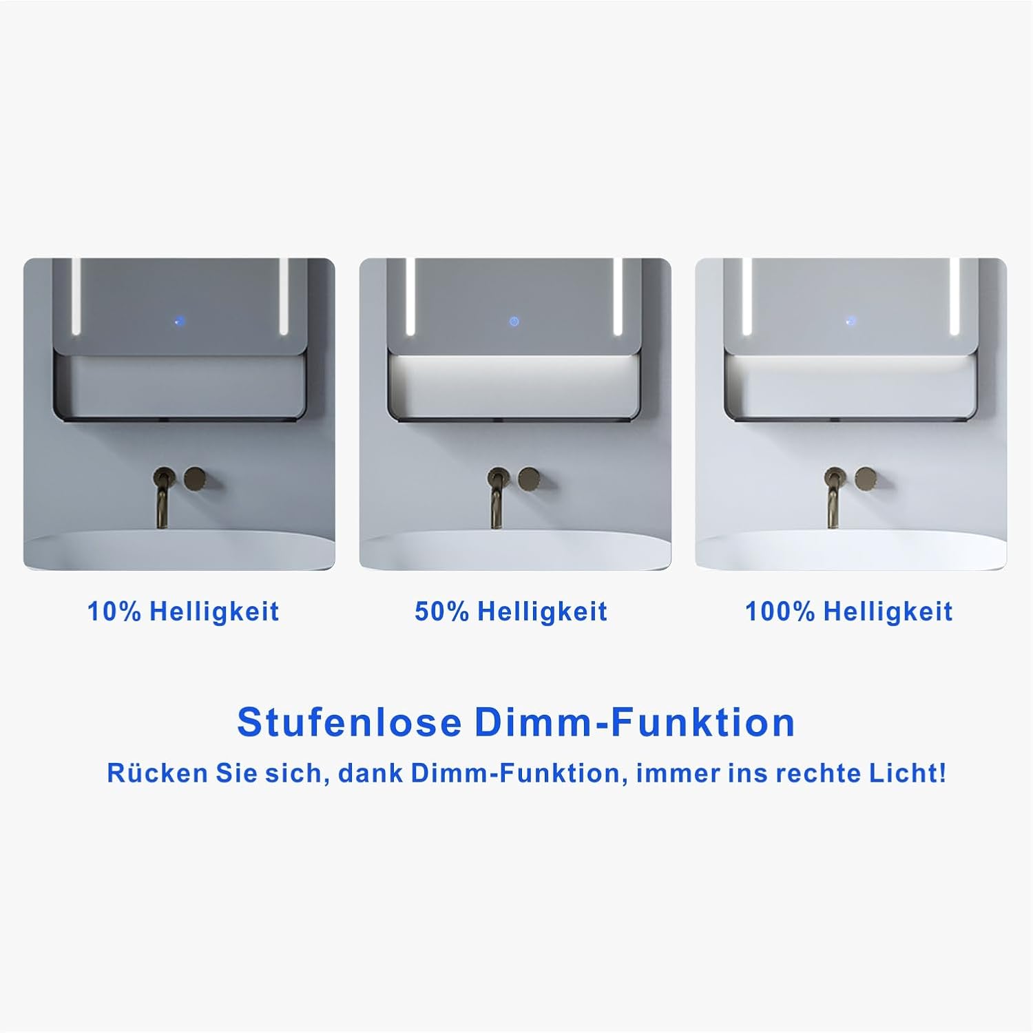 - ⭐⭐⭐⭐⭐【Dimm-Funktion】Die LED-Beleuchtung ist dimmbar. So können Sie den Spiegel nicht nur dazu nutzen, um Ihre Morgen- oder Abendroutine im Bad in angenehmem Licht durchzuführen, sondern Sie können durch die Dimm-Funktion auch für stimmungsvolles Licht sorgen.