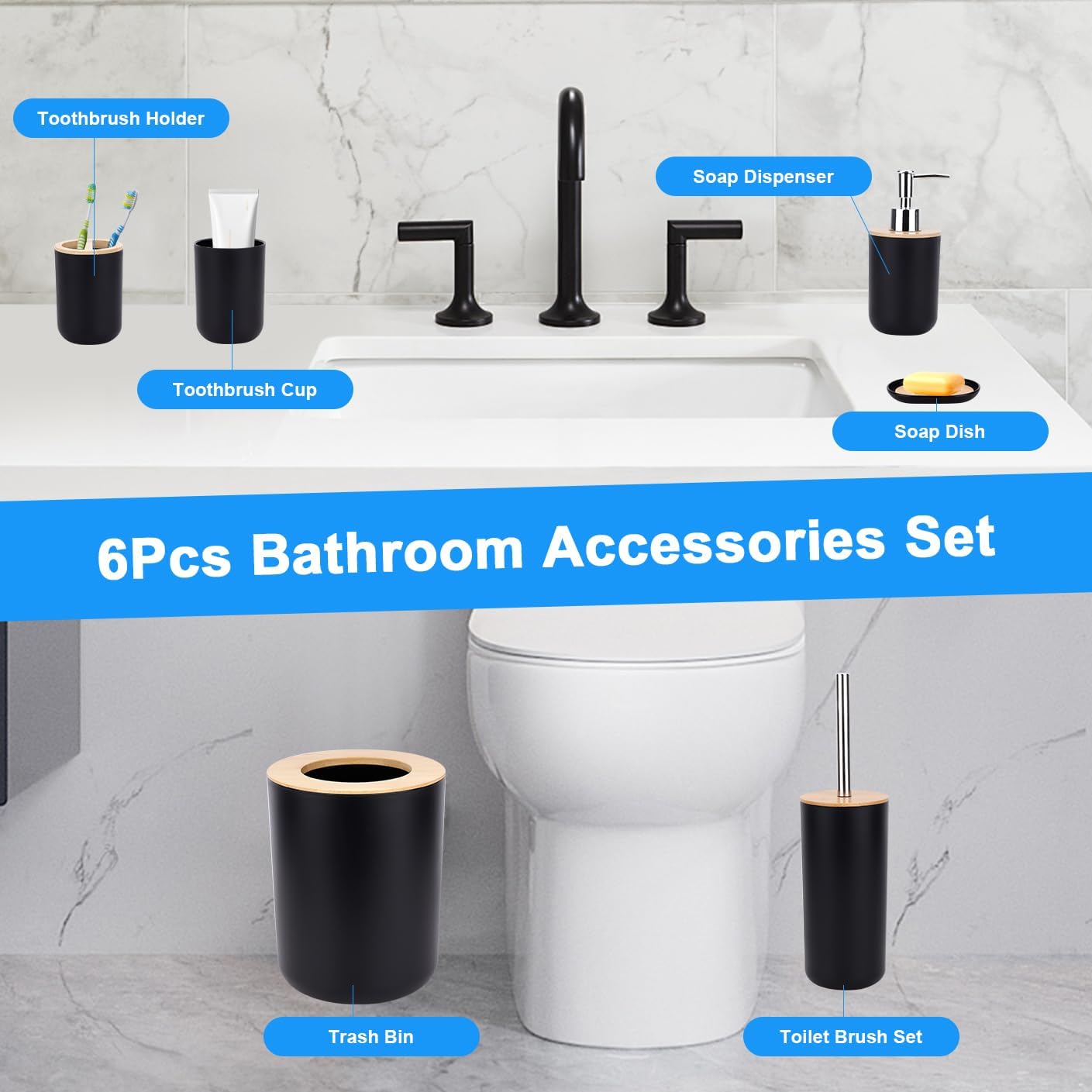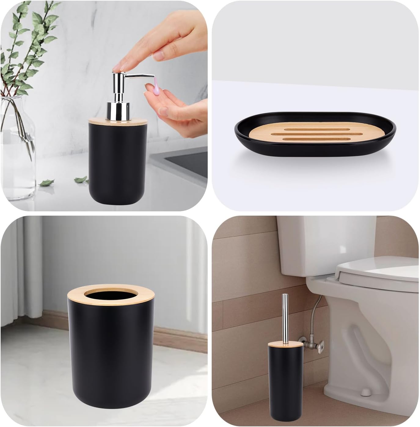 - Badezimmer-Zubehör-Sets: Lotionspender, Seifenhalter, Zahnbürstenhalter, Mülleimer, WC-Bürsten-Set, Spülbecher. Ein zeitgemässes Badezimmer-Set verhindert perfekt Unordnung auf Ihrem Waschraum.