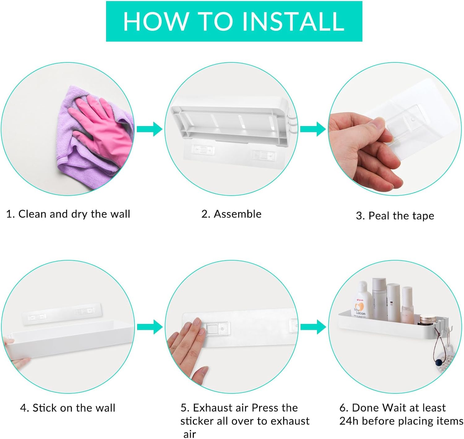 - 【Duschablage Ohne Bohren Weiss Erforderlich und einfach zu installieren】Ziehen sie die Selbstklebende Folie ab, Kleben Sie auf eine saubere Wand und Schon ist das Badezimmer Regal Montiert. Bitte Denken sie daran, auf den Selbstklebestreifen zu