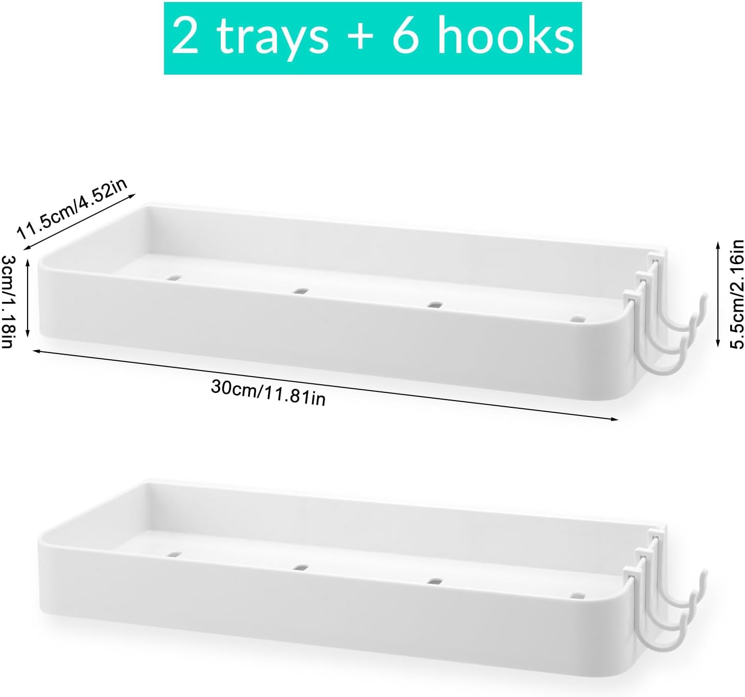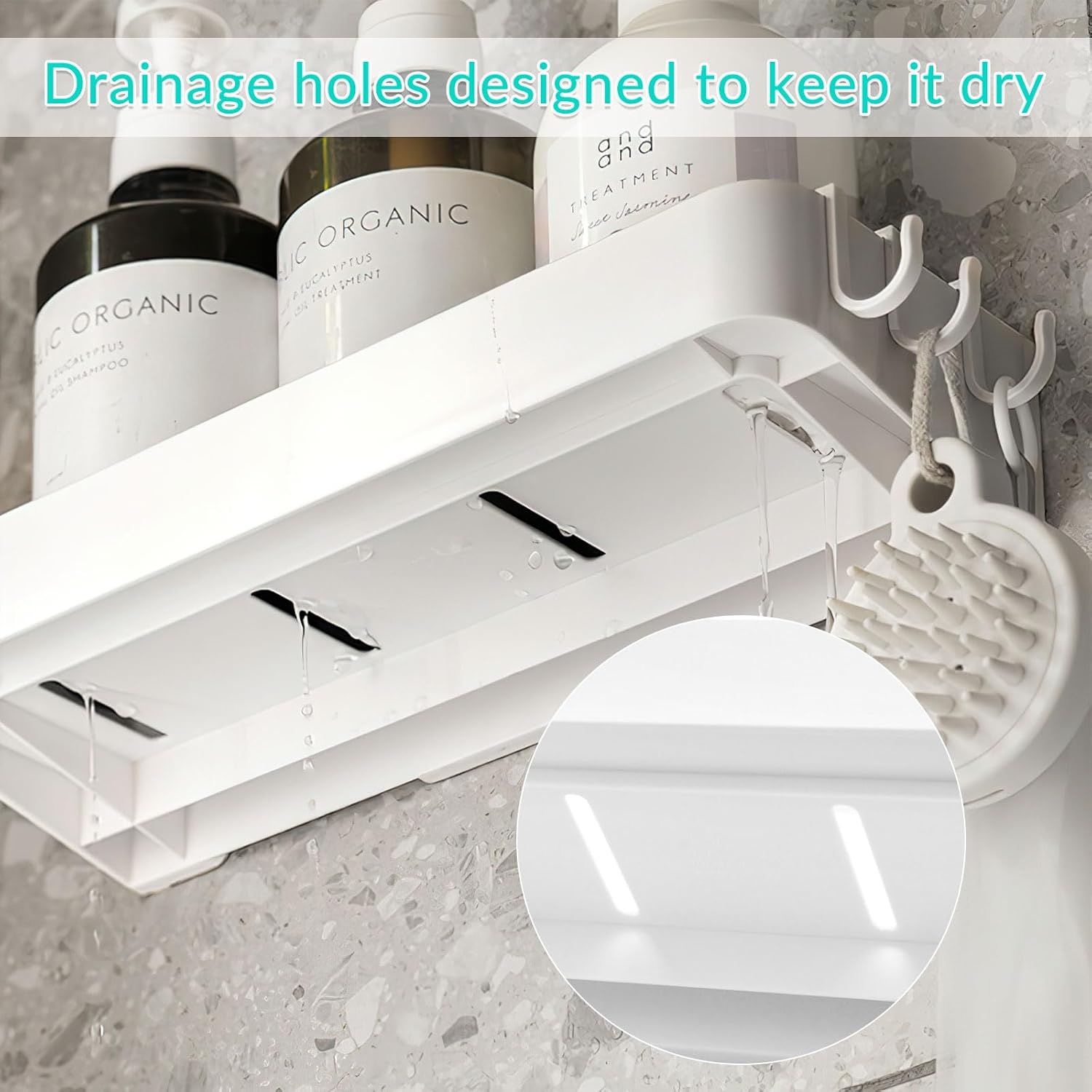 - 【Wandablage Bad Ausgezeichnetes Design】Duschregal Ohne Bohren Weiss 6 Abnehmbare und Abnehmbare Haken zum AufhäNgen von Schmuck, HaarbäNdern,BüRste,HandtüChern Usw. Die Duschablage ist integral Geformt, Gratfrei und hat vier Reihen von