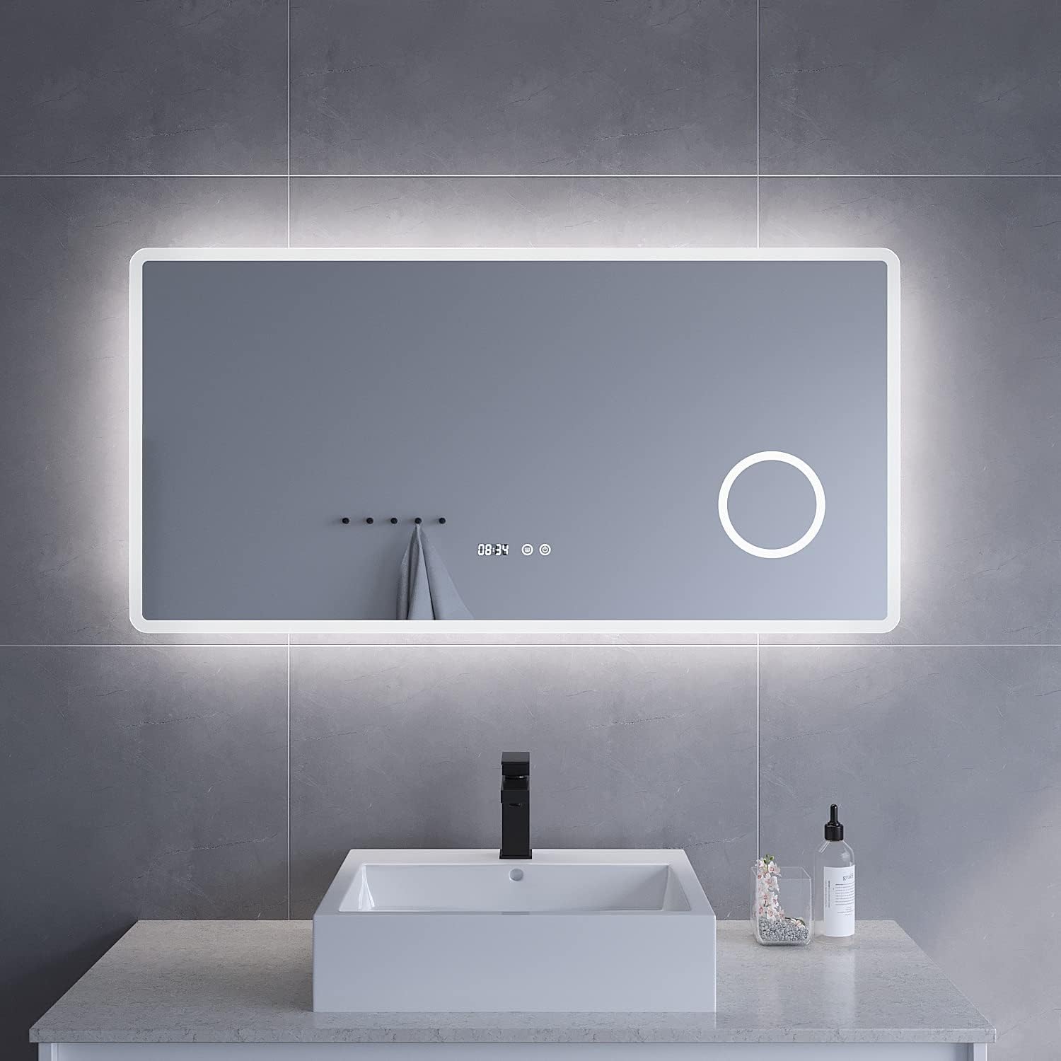 - ⭐⭐⭐⭐⭐【Badspiegel mit Kosmetikspiegel und Digitaluhr】Unser Badspiegel ist mit einem Kosmetikspiegel von 3-Fach-Vergrösserung ausgestattet. Der Kosmetikspiegel ist zusätzlich mit LED Leuchtstreifen versehen, damit haben Sie bei Ihrer täglichen Schönheitspflege auch die Details immer sicher im Blick. Sie können die Digitaluhr jederzeit ein- oder ausschalten. Wenn Sie die Digitaluhr ausschalten, läuft sie im Hintergrund weiter.