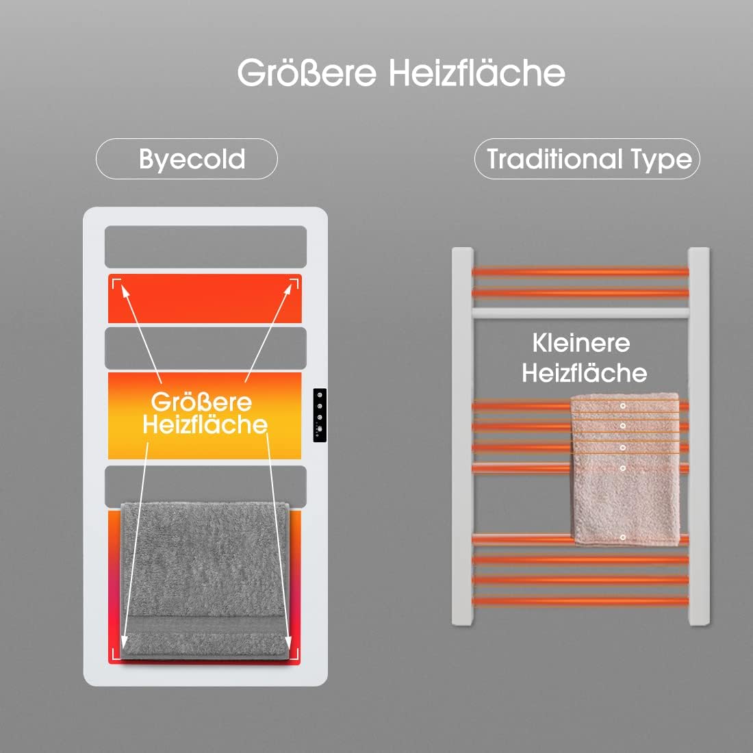 - Hohe Trocknungseffizienz: Im Vergleich zu herkömmlichen Handtuchhaltern verfügen Byecold Handtuchheizkörper über eine grössere Heizfläche, sodass Sie Ihre Handtücher schneller trocknen können.