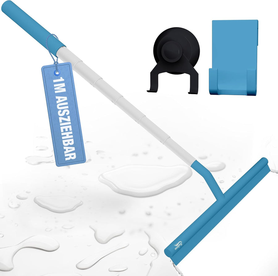 - 💧 AUSZIEHBARE INNOVATION : Blauer Duschabzieher Breit mit Teleskopstange aus rostfreiem Aluminium - Verlängerbar bis 100cm und somit Ideal als Duschabzieher oder als ausziehbarer Fensterwischer geeignet - Perfekter Scheibenwischer Dusche