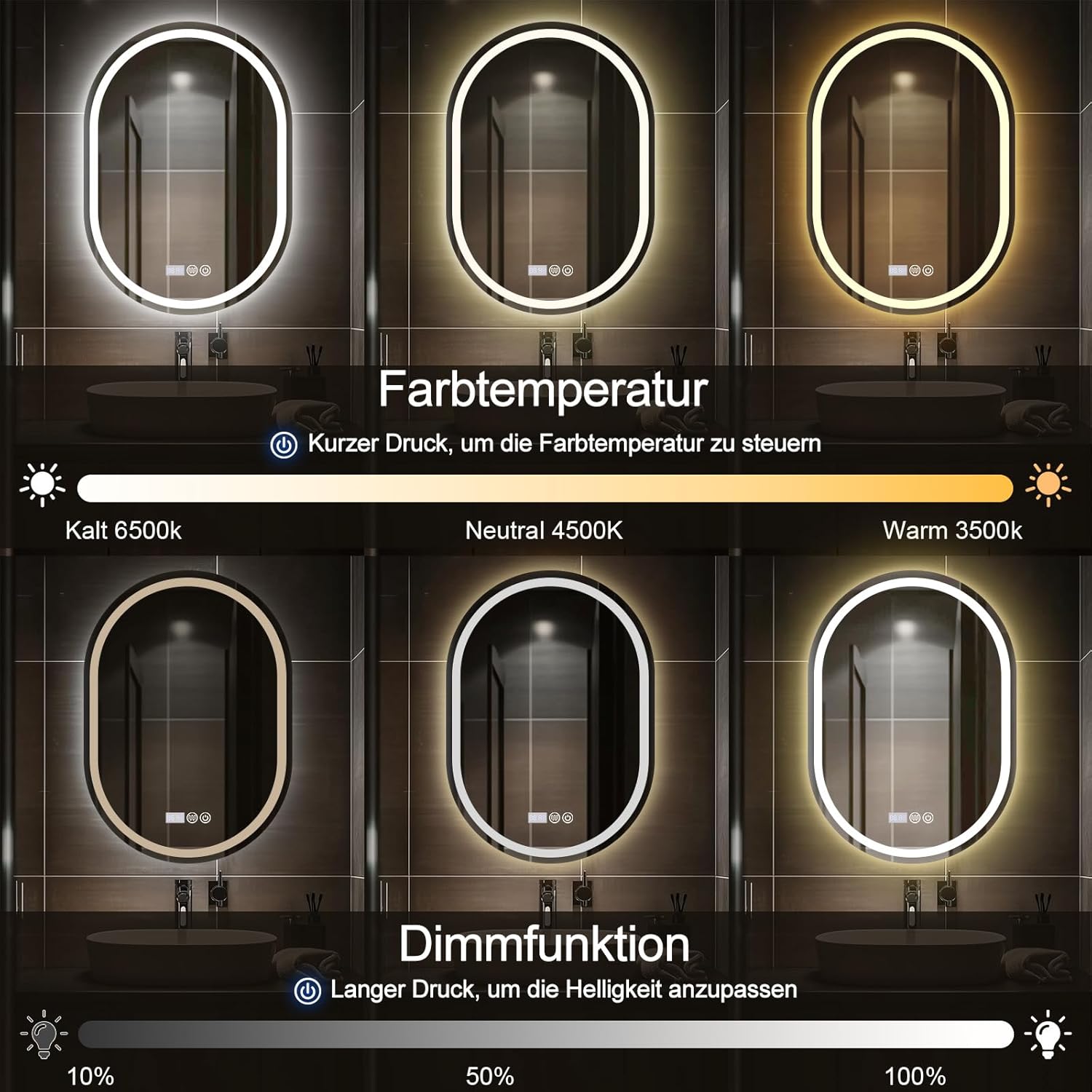 - [Individuelles Lichterlebnis] Badezimmerspiegel mit beleuchtung mit drei unterschiedlichen Farbmodi (warm 3500 K, natürlich 4500 K, kühl 6500 K) sowie einer Helligkeitsanpassung von 10 % bis 100 % per Touch-Sensor können Sie das Licht genau Ihren