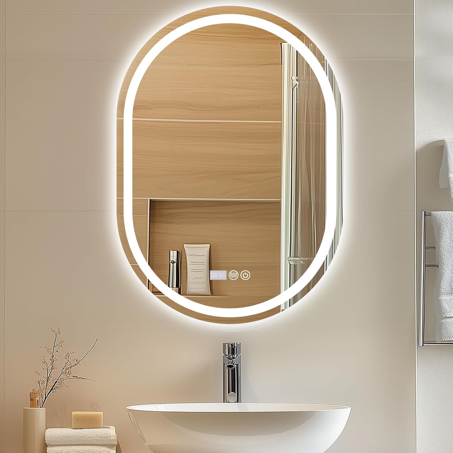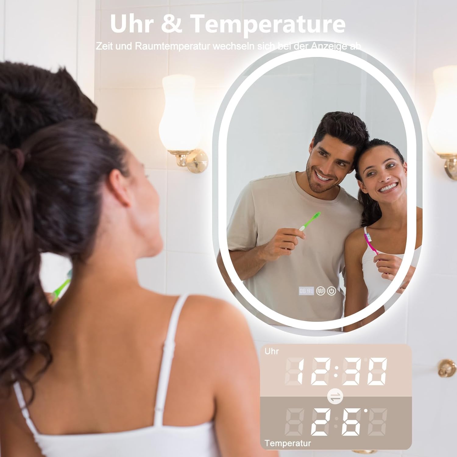 - [Uhr und Temperaturanzeige] Die digitale Anzeige auf dem ovalen Badezimmerspiegel leuchtet automatisch auf, wenn sie eingeschaltet ist, und die elektronische Anzeige wechselt zwischen der Zeit und der Raumtemperatur, die Sie an den Zeitplan und die