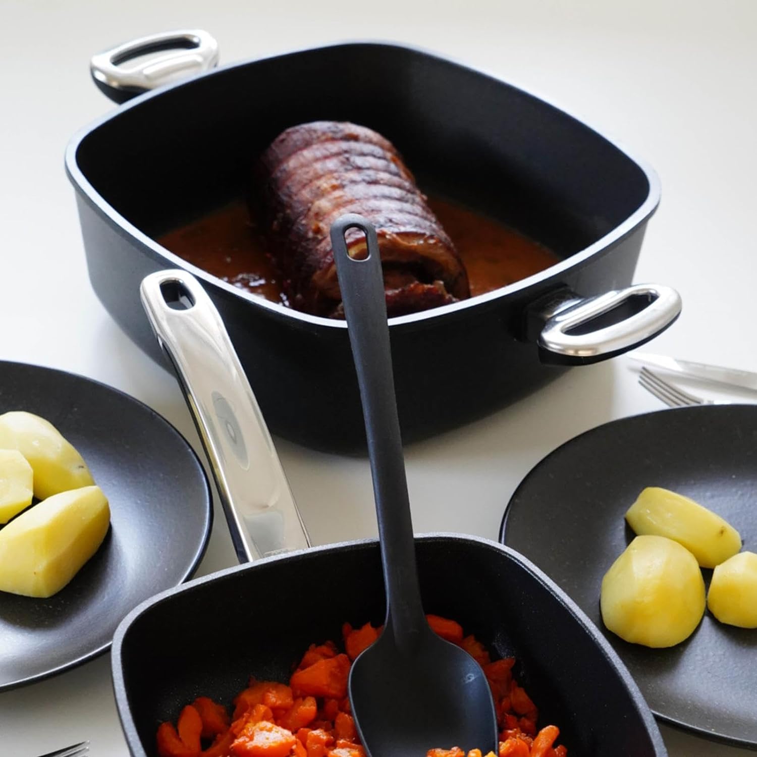 - Der bis zu 260°C backofenfeste eckige Aluguss-Bräter mit Seitengriffen, hohem Rand ist hoch-erhitzbar, somit bei der Verwendung hitzebeständiger Öle und Fette mit der abgestimmten Brattemperatur optimal zum scharfen Anbraten von Fleisch wie Steak und